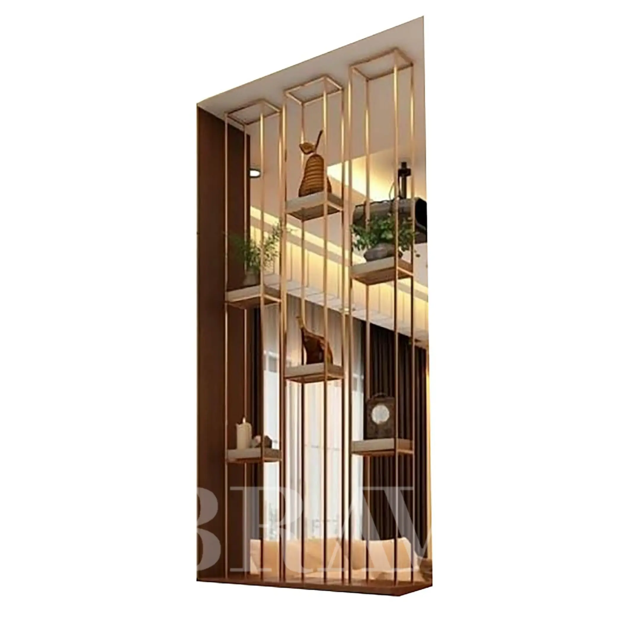 فاصل غرفة عمودي فاخر مع أرفف عرض متعددة الطبقات – شاشة تقسيم خشبية ومعدنية فاخرة