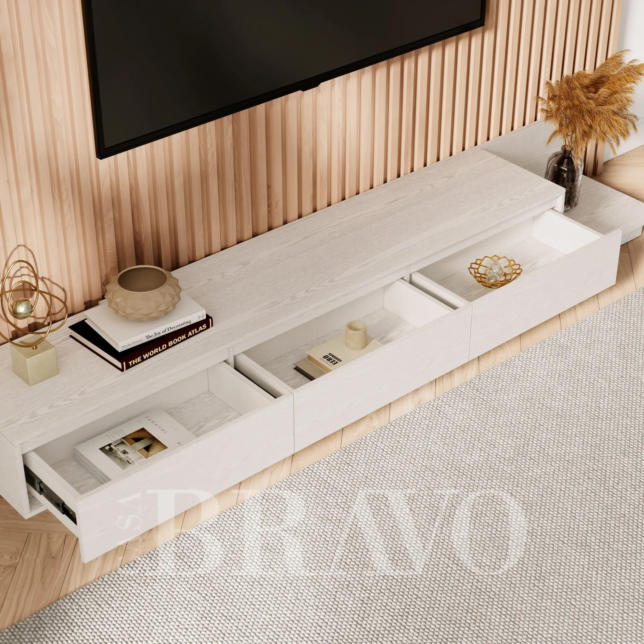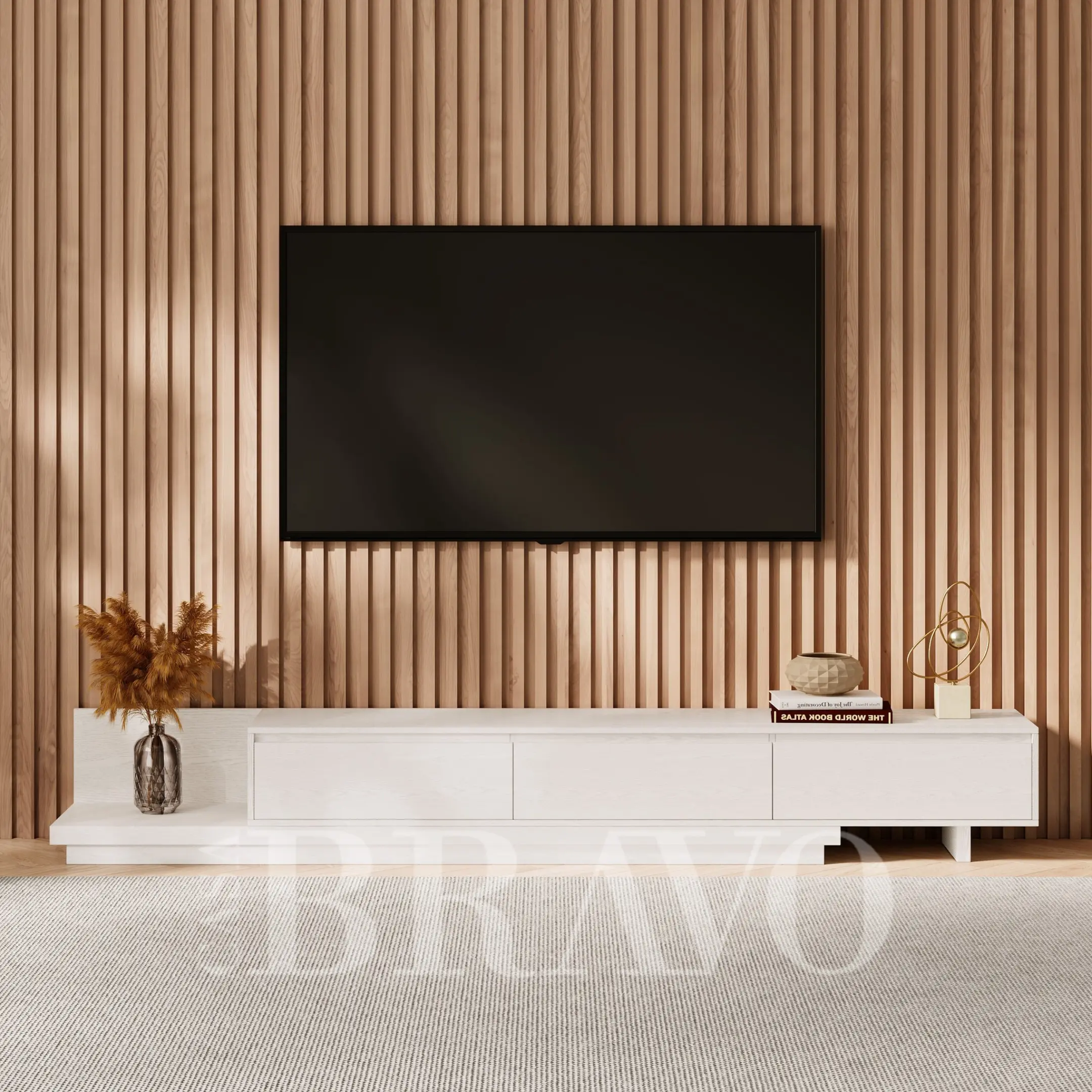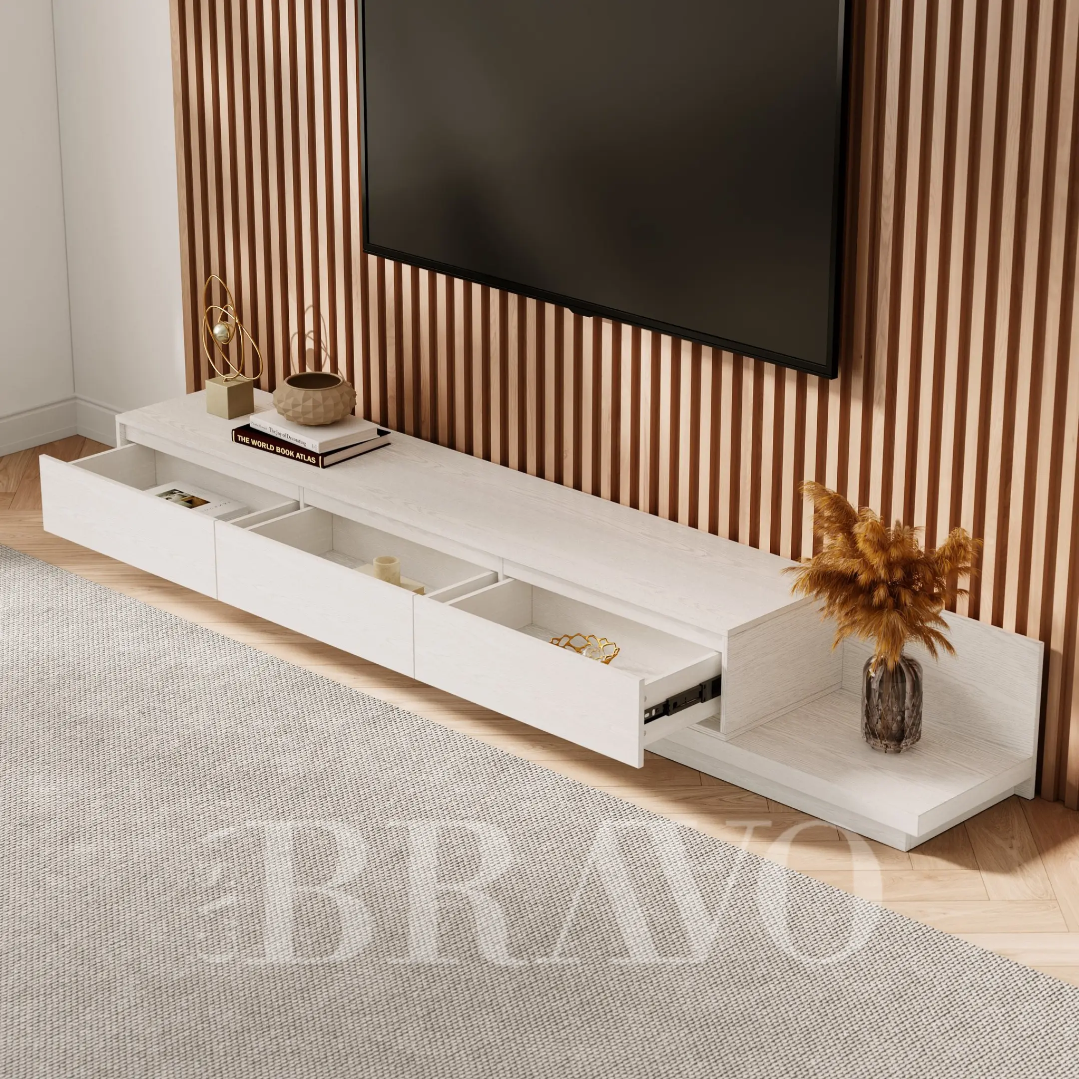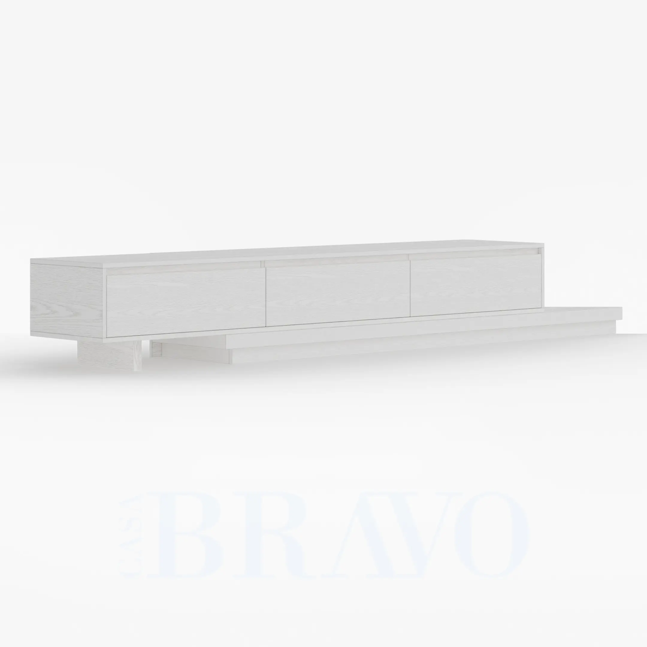A serene all-white TV stand crafted with soft wood grain texture, offering a clean and airy aesthetic. Its extended layered base adds a modern architectural touch, while the spacious drawers keep your living area beautifully organized and clutter-free.