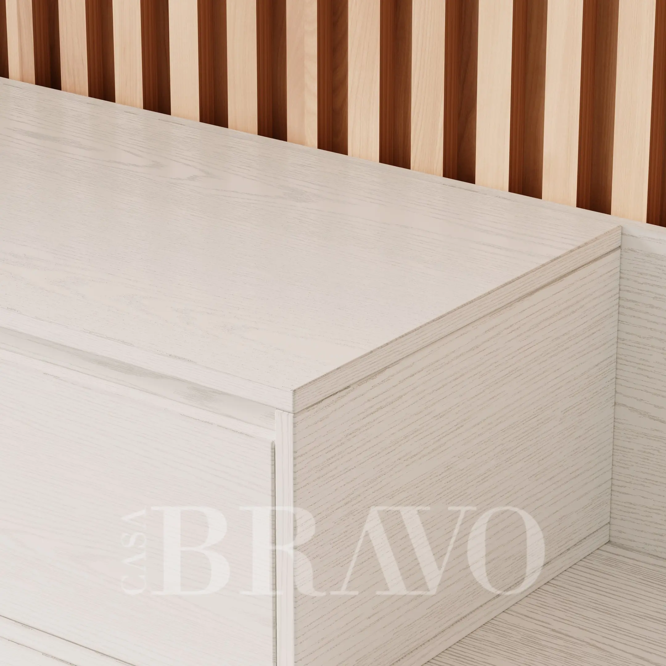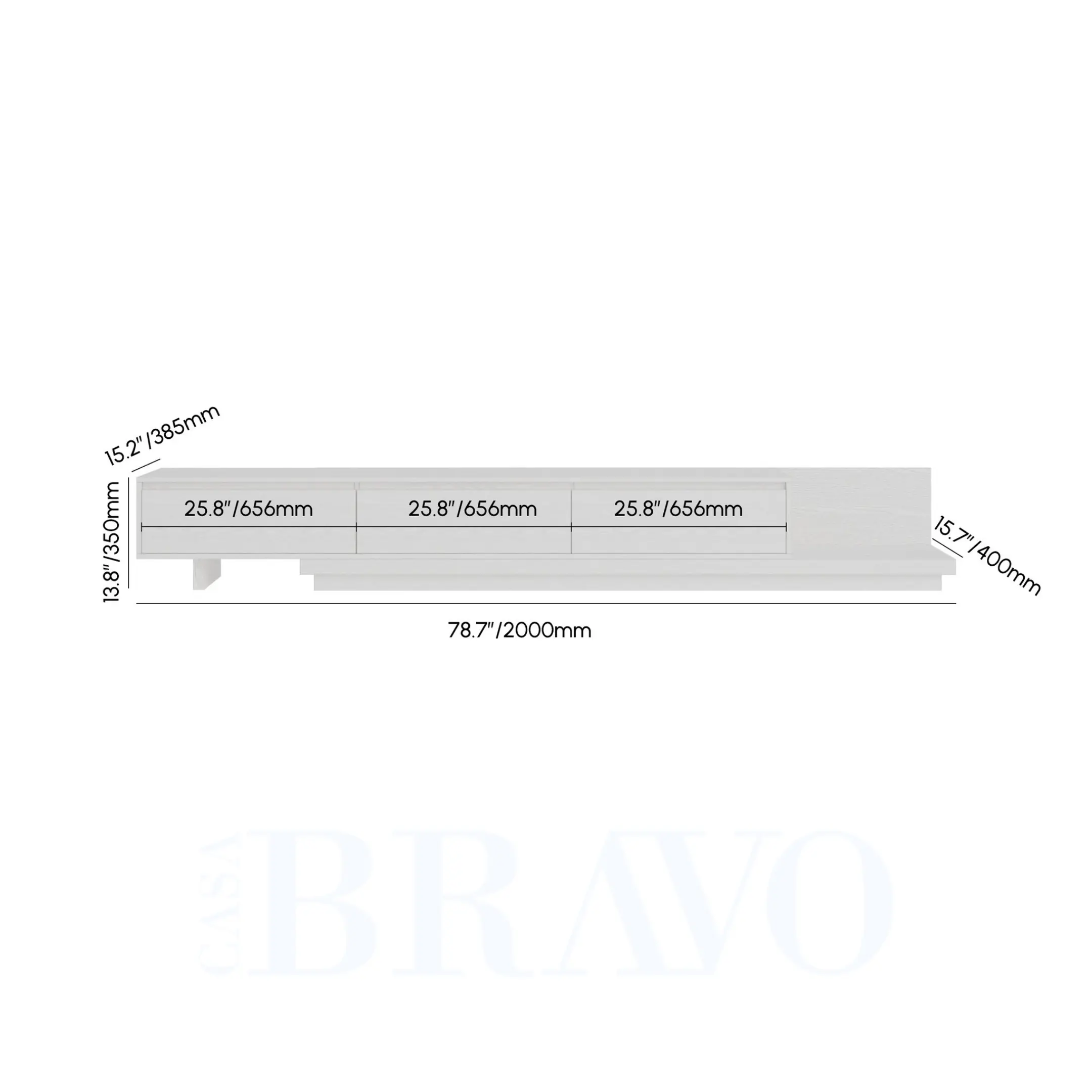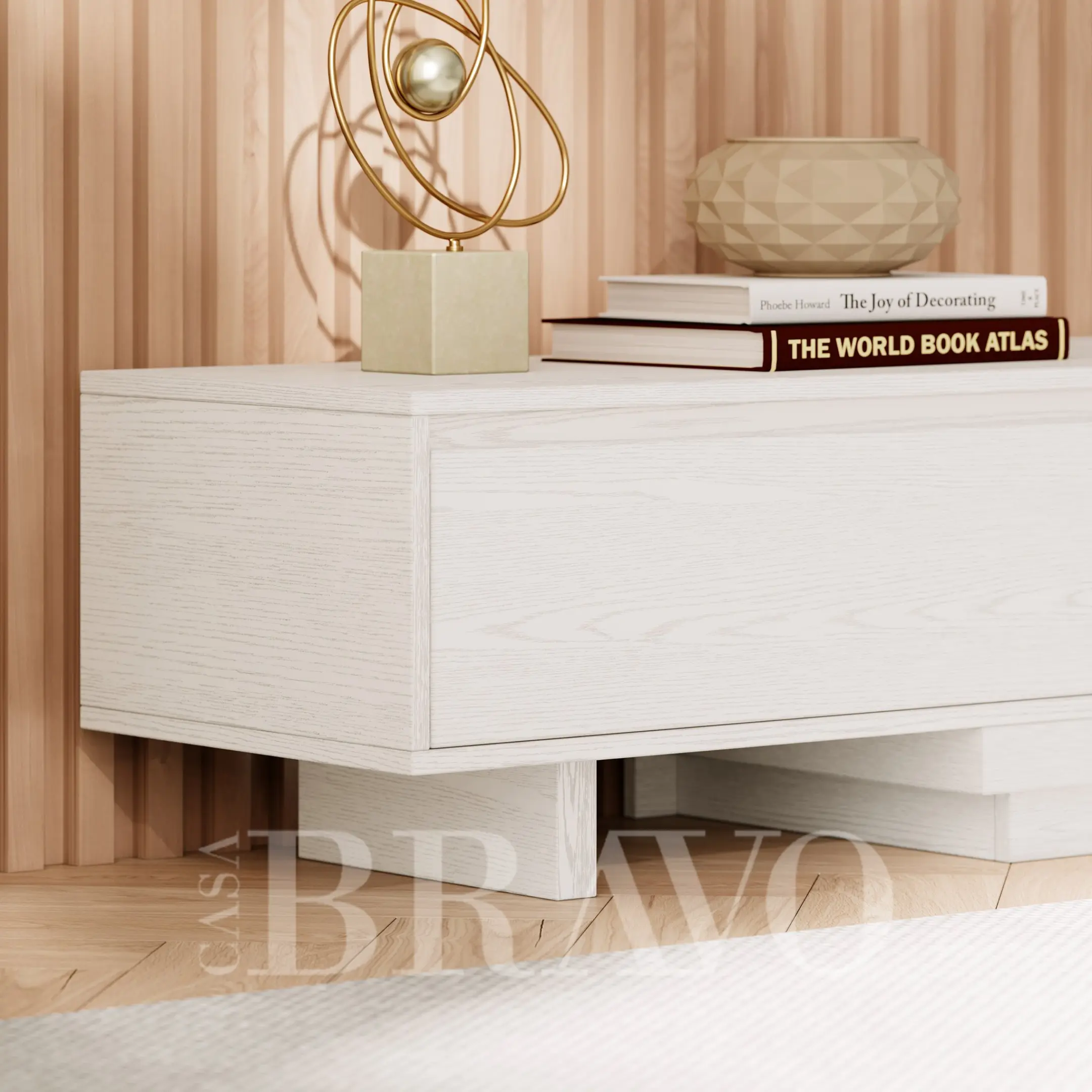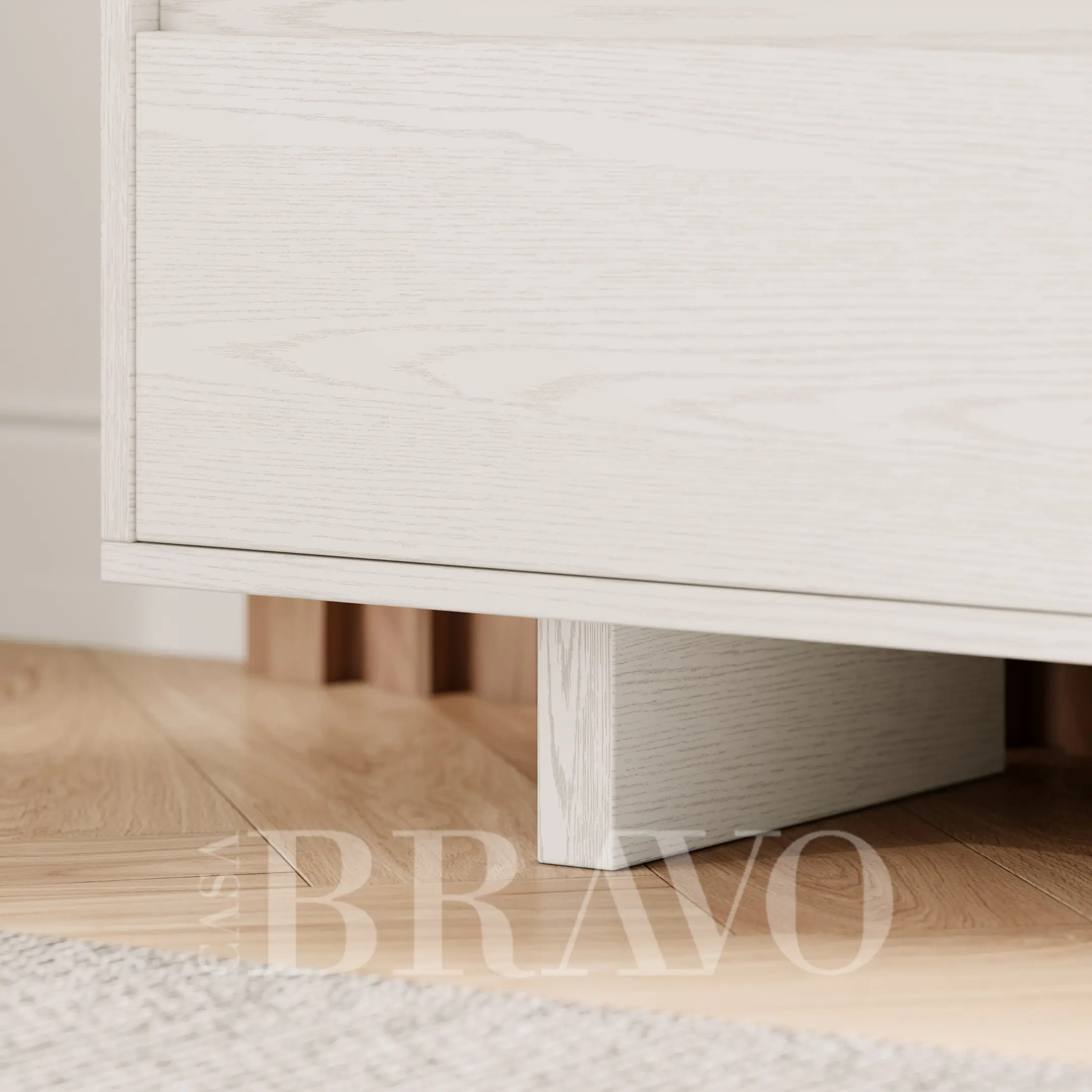 A serene all-white TV stand crafted with soft wood grain texture, offering a clean and airy aesthetic. Its extended layered base adds a modern architectural touch, while the spacious drawers keep your living area beautifully organized and clutter-free.