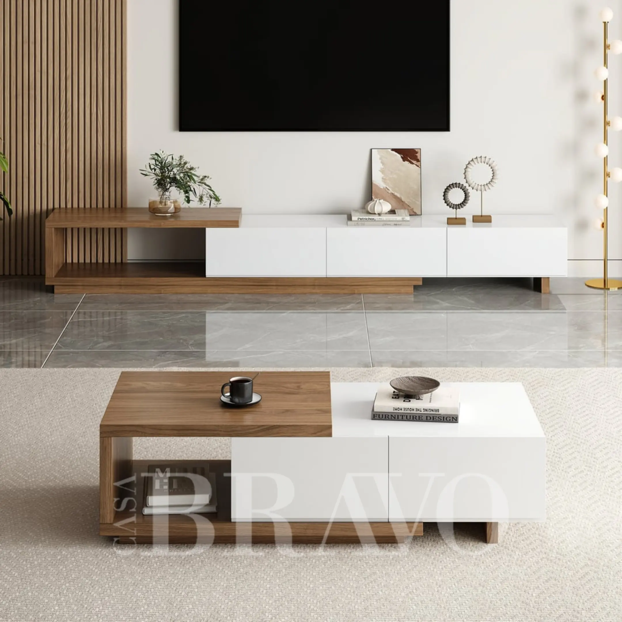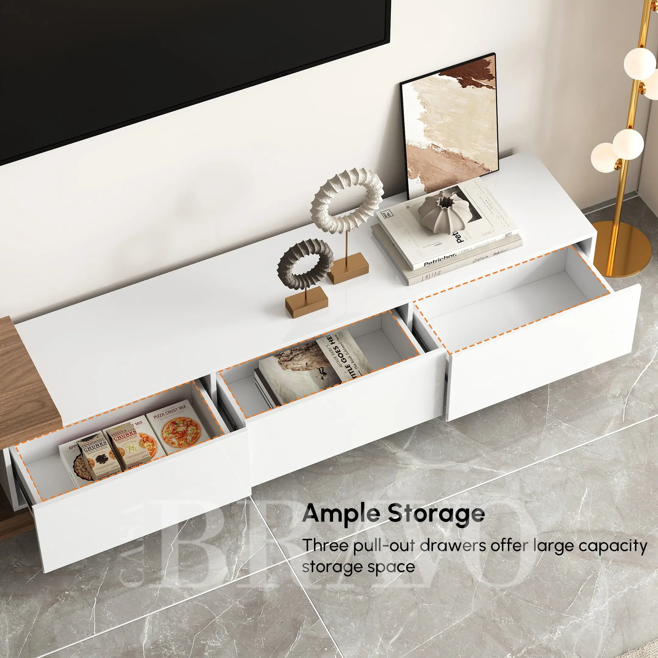 A modern blend of crisp white and warm walnut, this TV stand adds airy elegance to any living space. Its open side shelf creates a light, architectural look, while three spacious drawers offer smooth, hidden storage for a clean and minimalist entertainment setup.