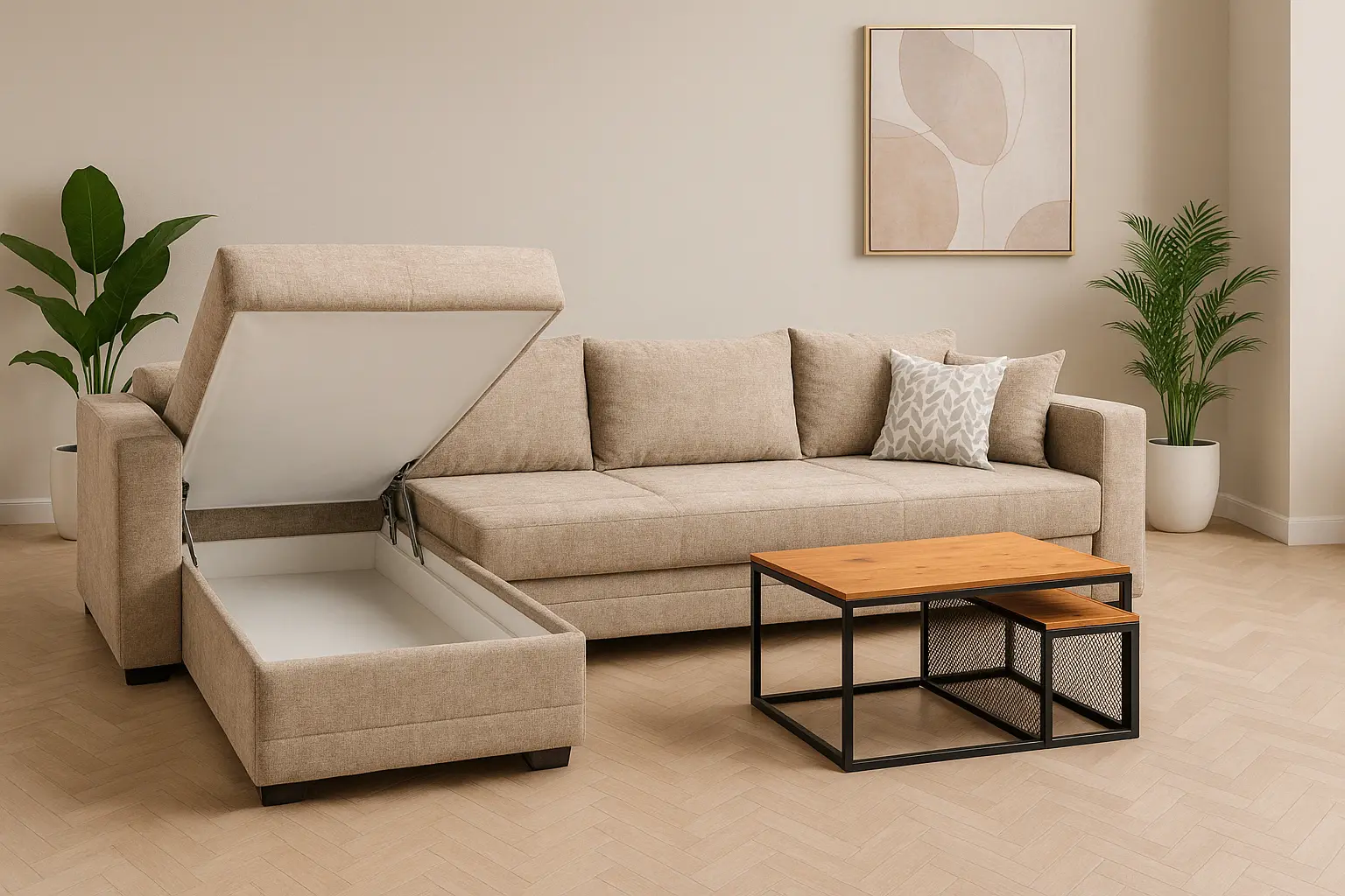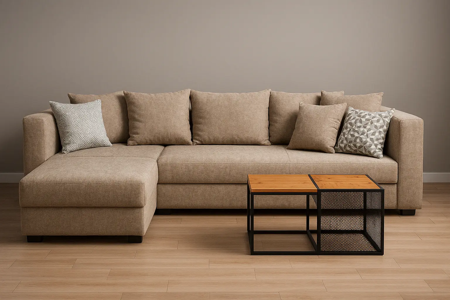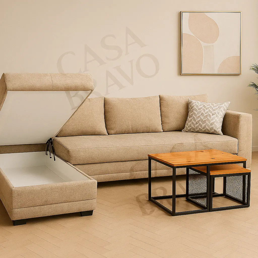 Make a clever purchase with this modern furniture fit to be used as a three-seater corner sofa . Sporting a sophisticated design, this unit is well-equipped with a smart storage system and a reversible chaise pattern that can be placed on the left or right side, as per your requirement. It promises maximum cosiness owing to the polyurethane foam, recycled foam, polyester fibre and non-woven bag seat filing. It features a supportive back style, straight armrests and a sturdy base. Easy to maintain, this luxurious furniture is crafted with soft fabric upholstery and is an ultimate space saver.