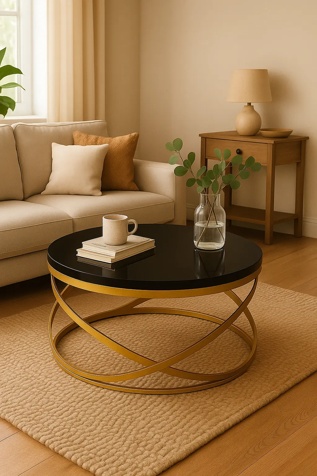A striking blend of luxury and modern artistry, this center table features a glossy black top paired with an elegant gold interlaced base. The fluid, crisscrossing metal rings create a sculptural silhouette, giving the piece a sense of movement and sophistication. Perfect for contemporary interiors, it adds a bold yet refined statement to any living space.