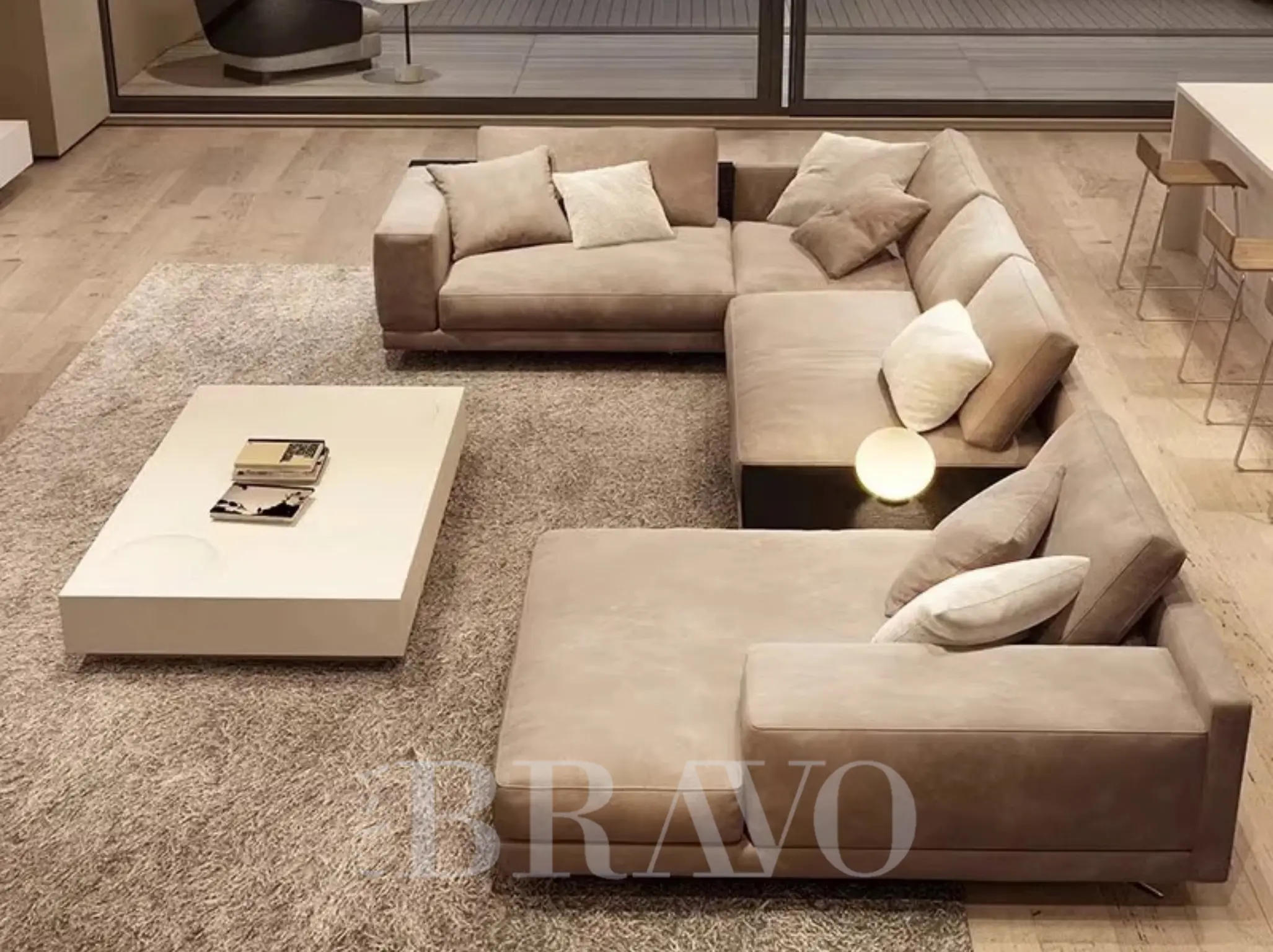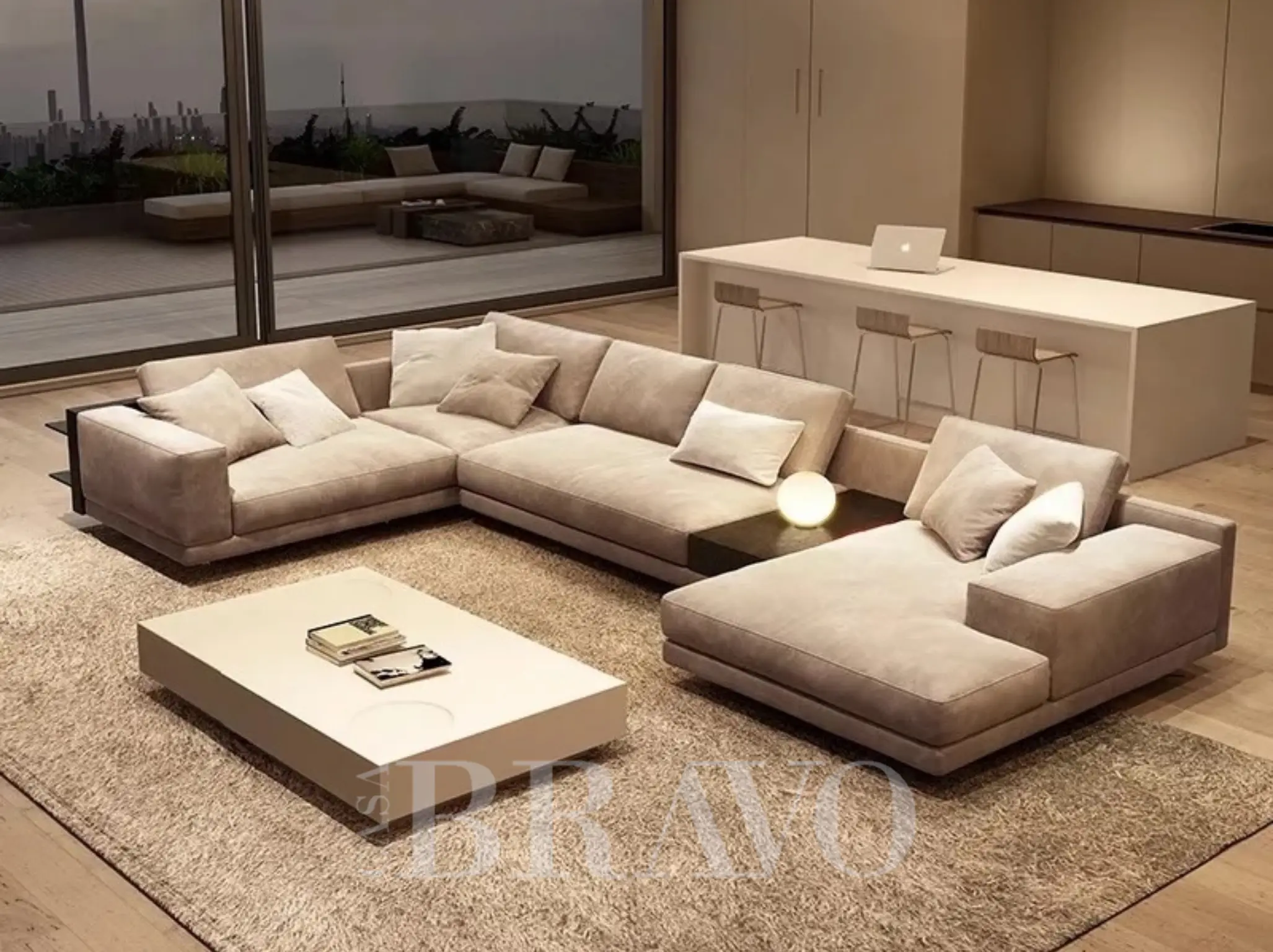 U-Shaped Sofa, offering generous seating for large gatherings. The sofa’s U-shape ensures ample seating space, making it perfect for family events and hosting guests. With fabric consoles cleverly integrated, enjoy convenient storage and organisation. Part of the esteemed Eterno collection, this piece combines style with functionality, reflecting the value of family and hospitality in your home.