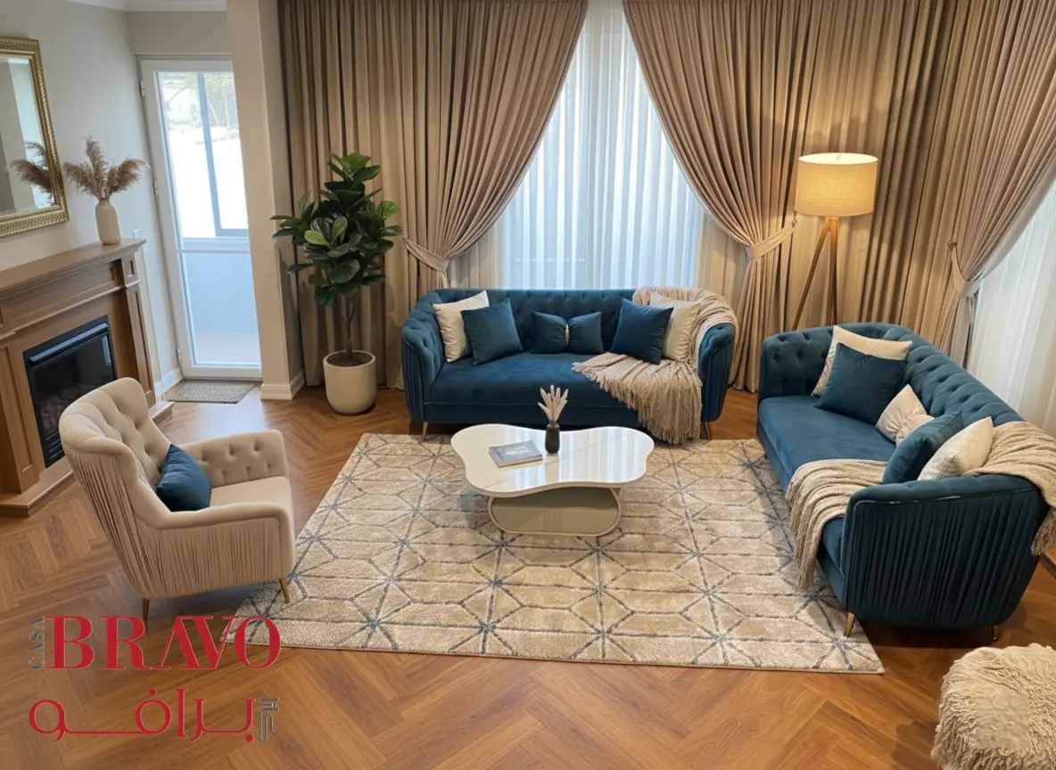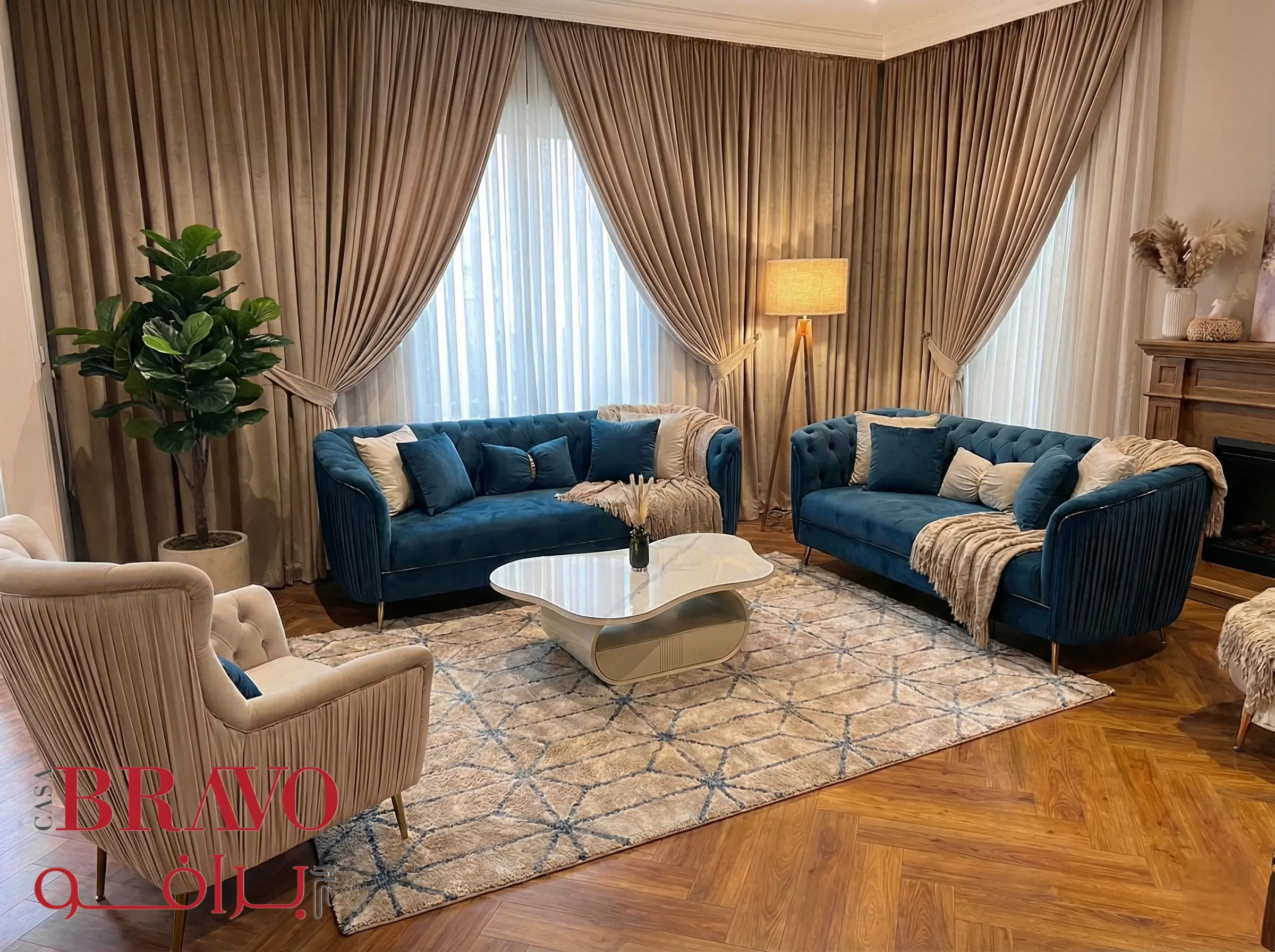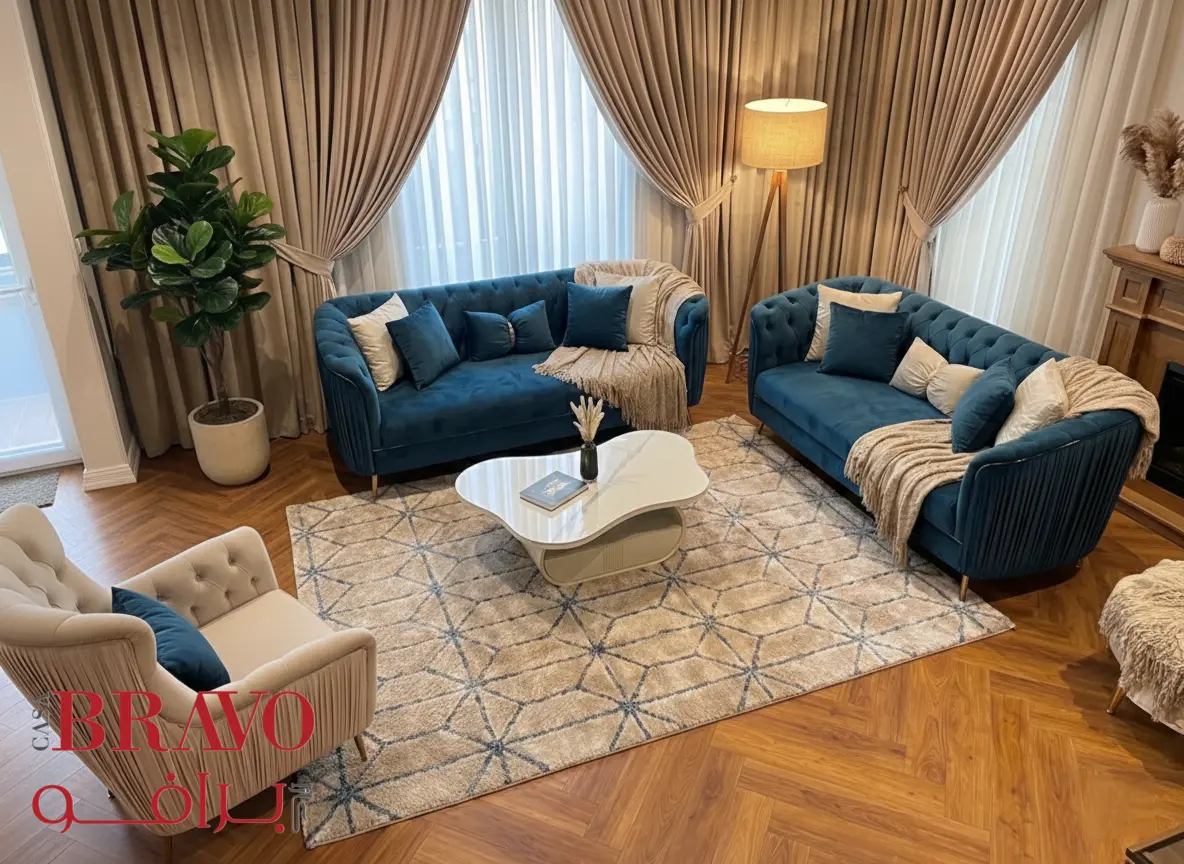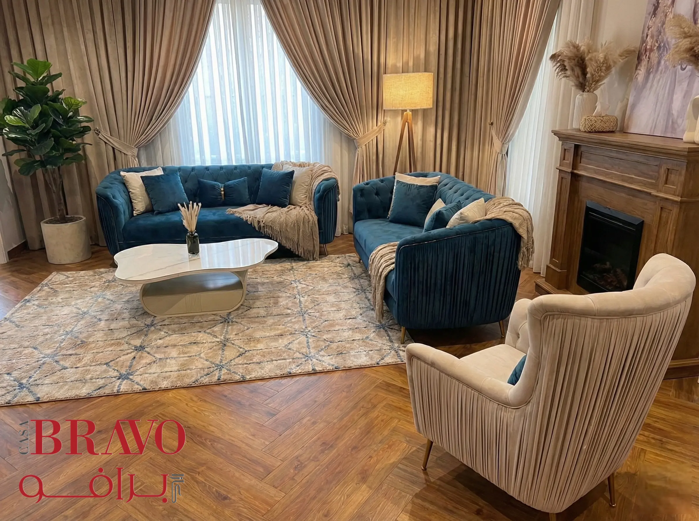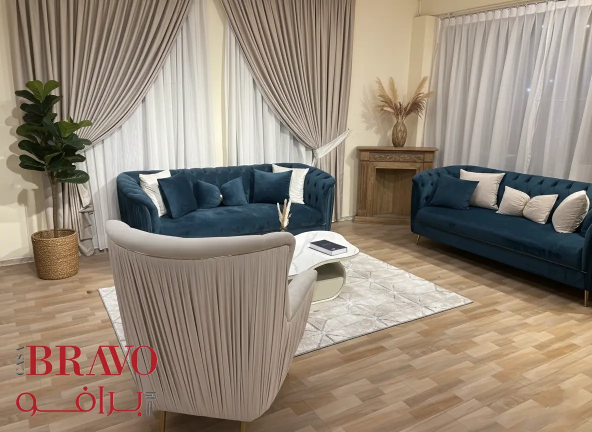 This stunning sofa set brings regal elegance to your living space, creating a refined and luxurious atmosphere. The set includes two three-seater sofas and an armchair, each thoughtfully crafted with rich fabric upholstery and a durable beech wood frame for long-lasting strength and stability.