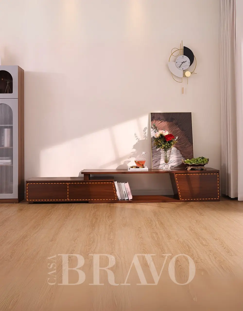 The Linea Walnut Media Console brings together sleek modern lines and rich natural warmth. Crafted in a premium walnut finish, it features spacious drawers, open shelving, and an elevated stepped design that adds visual depth. Its geometric side panel detail gives it a contemporary architectural touch, making it both stylish and highly functional for any modern living space.