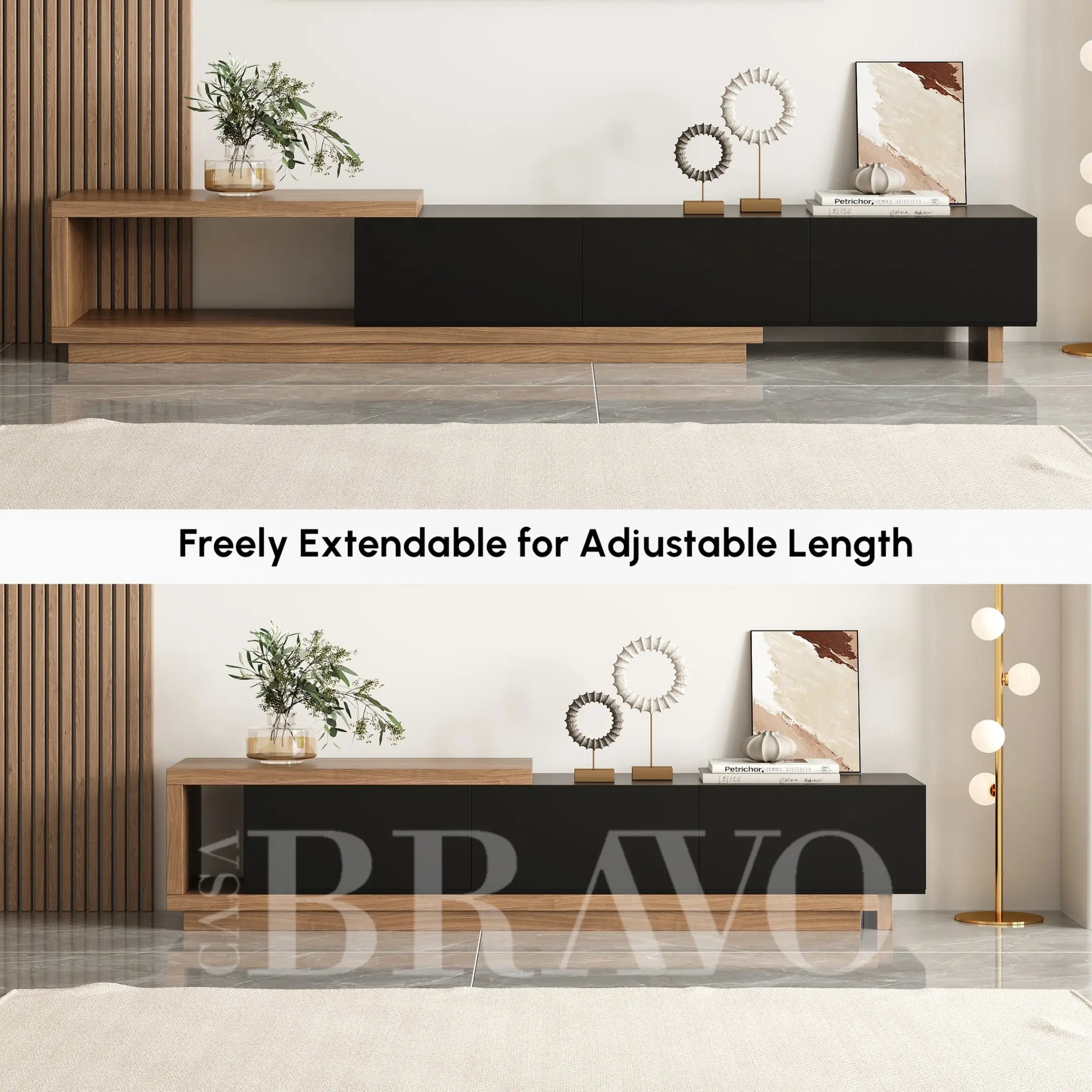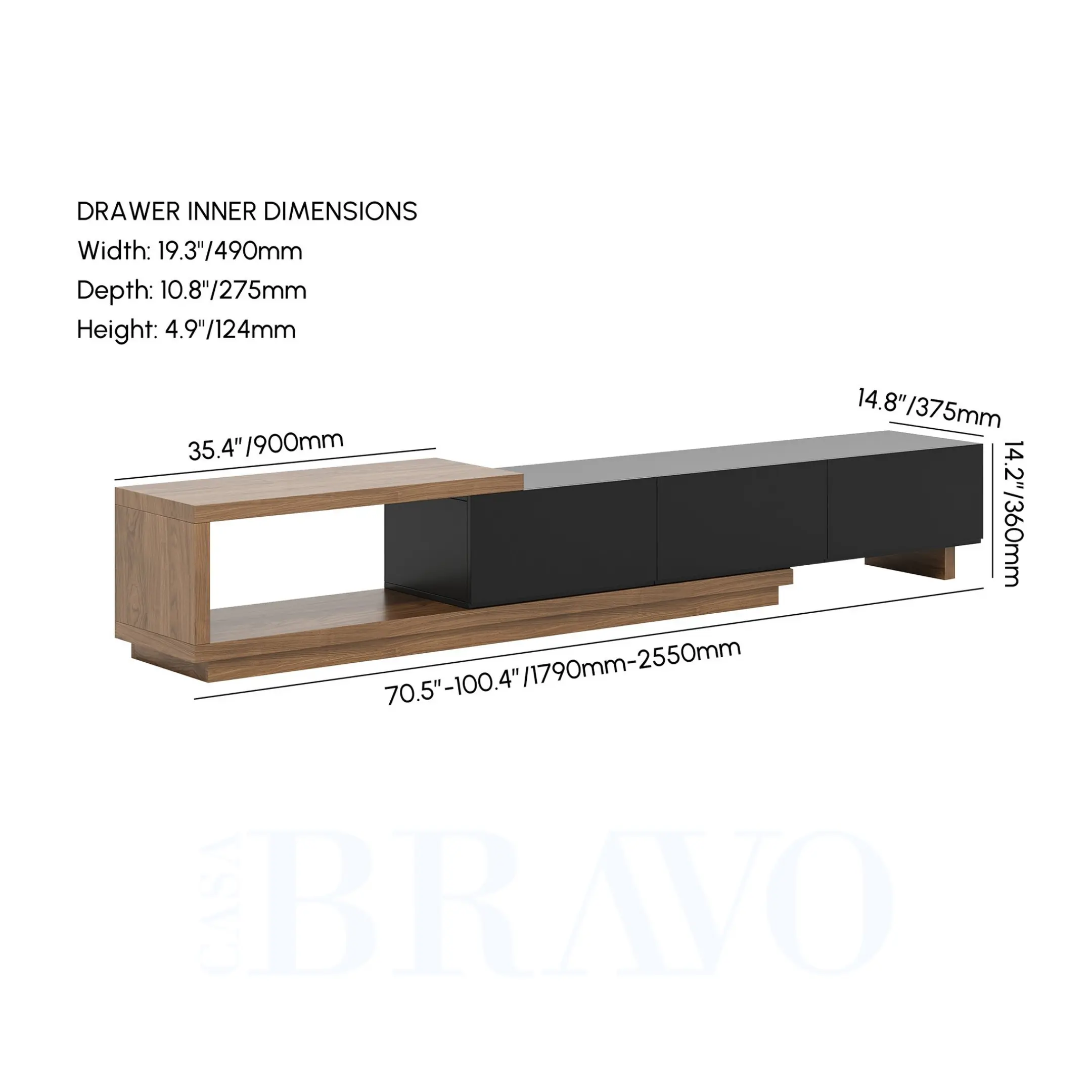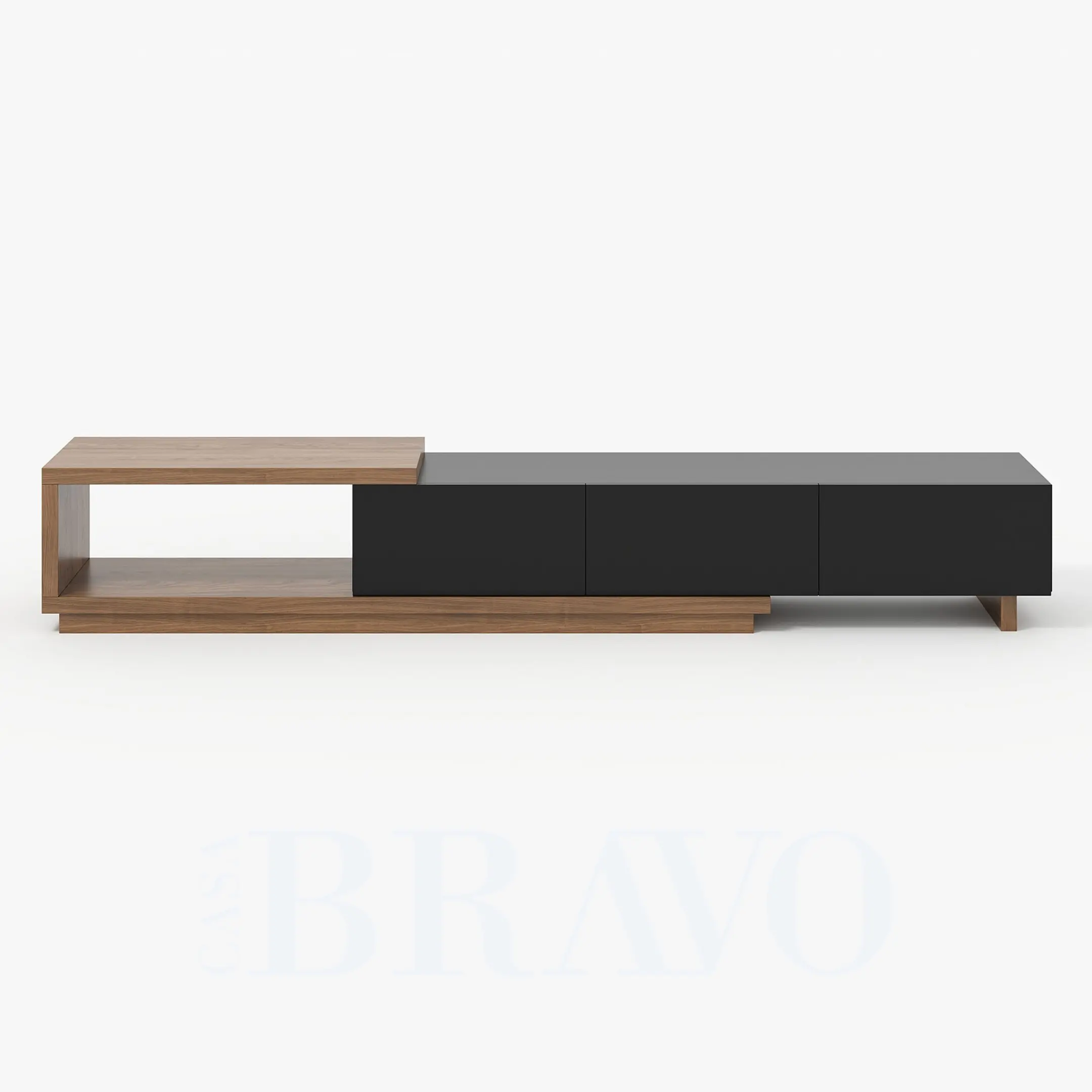A sleek contemporary TV stand combining matte black drawers with a warm natural wood frame. Its open-shelf extension adds architectural character while offering space for décor or media devices. Three smooth-glide drawers provide generous hidden storage, making it a perfect blend of style and functionality.