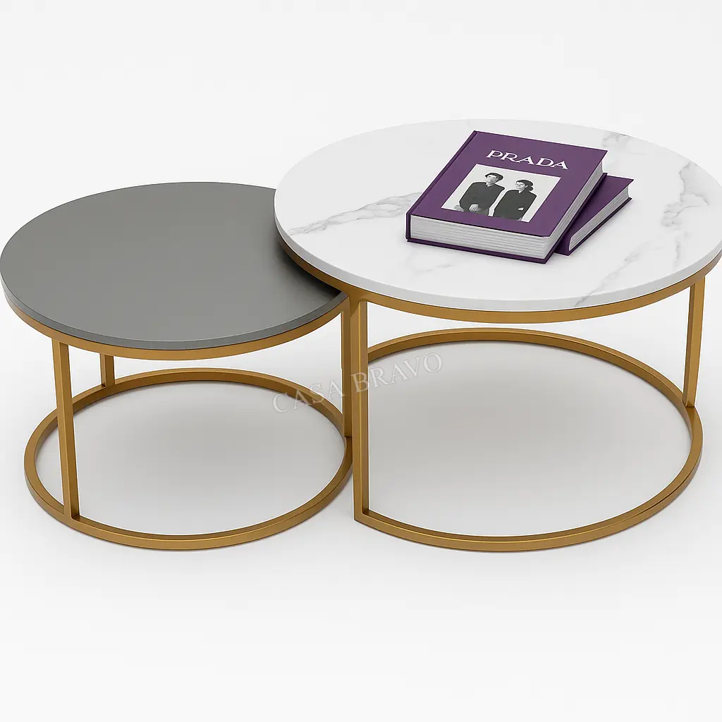 The Luna Duo Round Center Table Set blends elegance with everyday practicality. Featuring a striking two-tone design—one table in smooth grey and the other in luxurious white marble—both pieces rest on gold circular bases that add a touch of modern glamour. The nesting style allows flexible arrangement, making it perfect for contemporary living rooms that value style, versatility, and space efficiency.