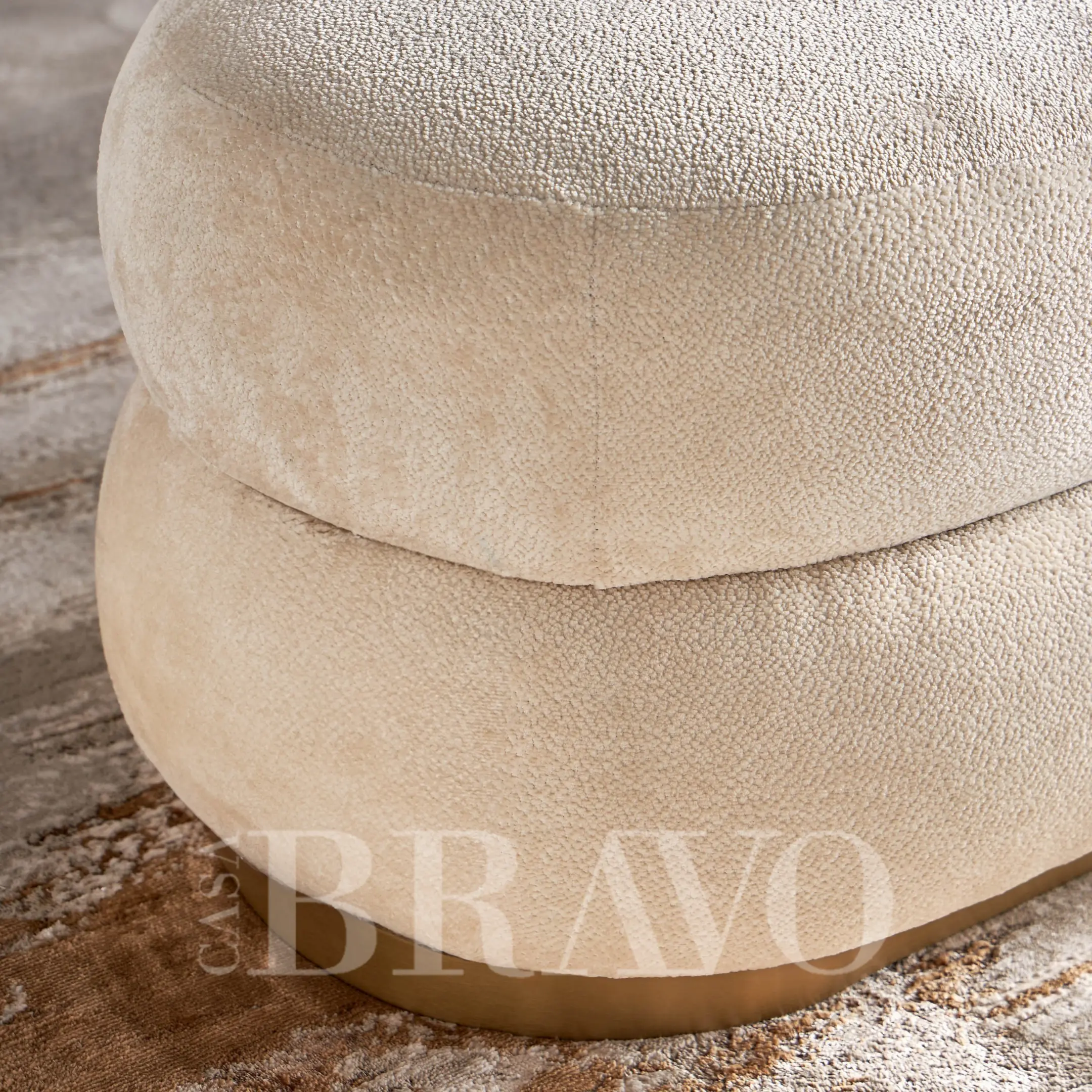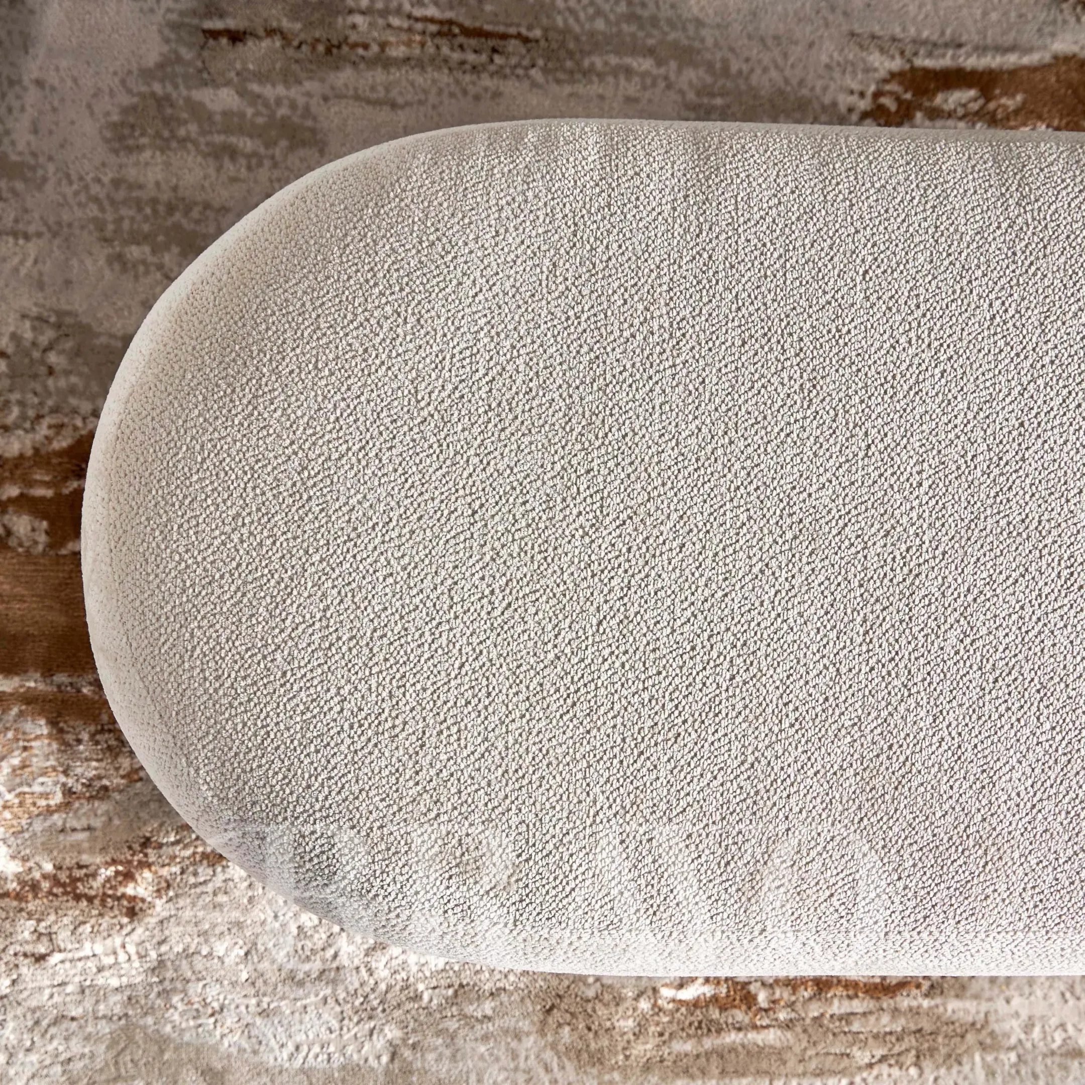 This ottoman features an inviting, generously padded oval shape with soft, rounded edges. It is meticulously upholstered in a premium, deep-textured fabric—likely a cream bouclé or high-quality plush textile—that adds tactile richness and visual warmth to your decor. The upholstery is expertly tailored, with a subtle seam creating a defined visual break around the middle, emphasizing its sculpted form.