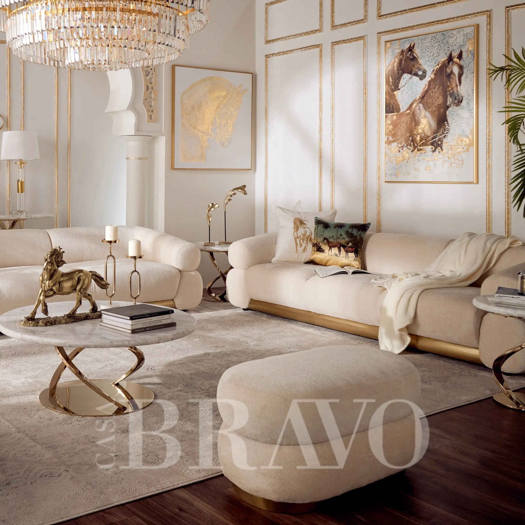 Elevating the entire design is a substantial, continuous gold metallic plinth base. This striking detail provides robust support and adds a significant touch of modern glam, making the piece appear to float elegantly above the floor. The combination of the soft, neutral fabric and the brilliant metallic base creates a perfect balance of comfort and sophistication.