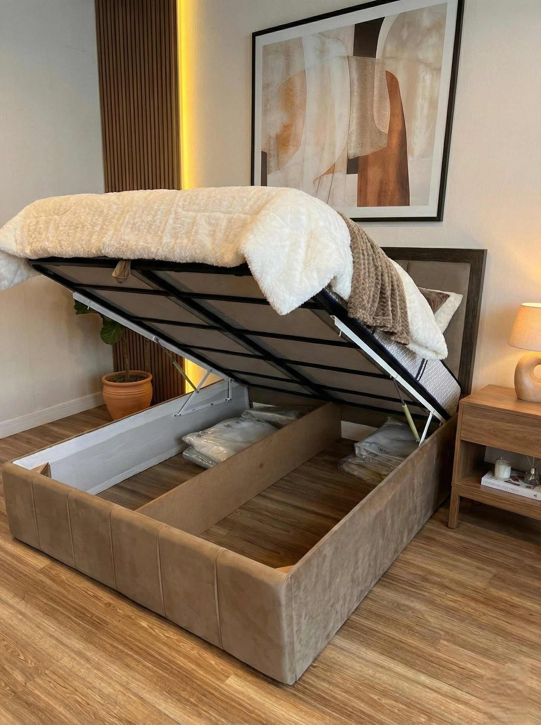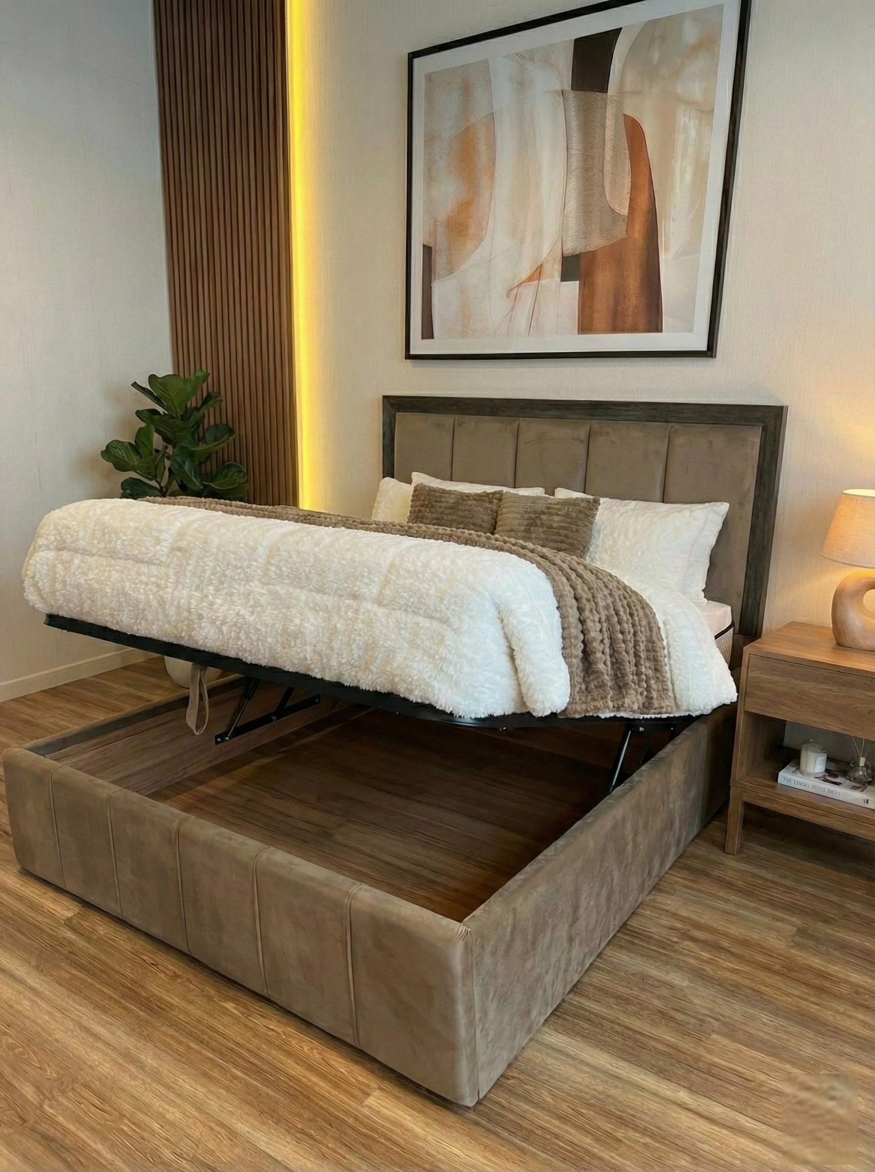 This bed is perfect for a comfortable night’s sleep, blending modern luxe style with practical features. It includes motion-sensor guide lights that illuminate as you approach, helping you navigate in the dark. Made of engineered wood with a sturdy frame, this bed is designed for durability, ensuring it will last for years to come.Providing ample space to store your bedding essentials, extra clothes and more is the hydraulic storage.