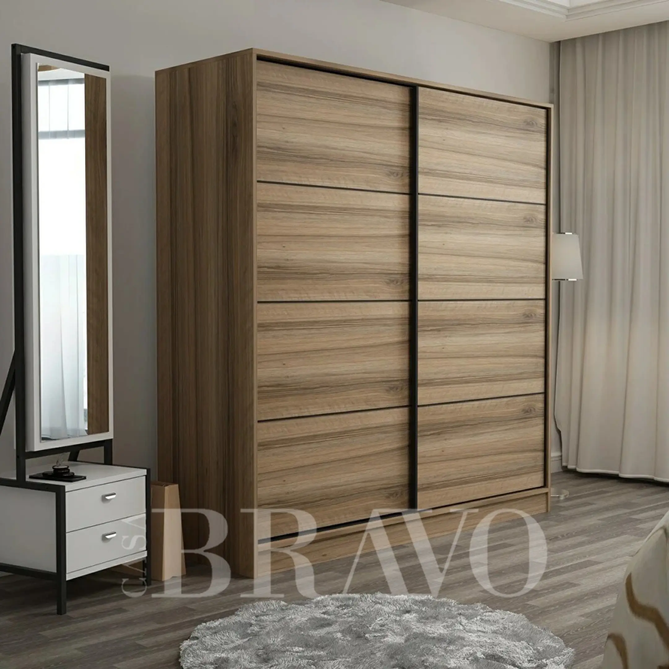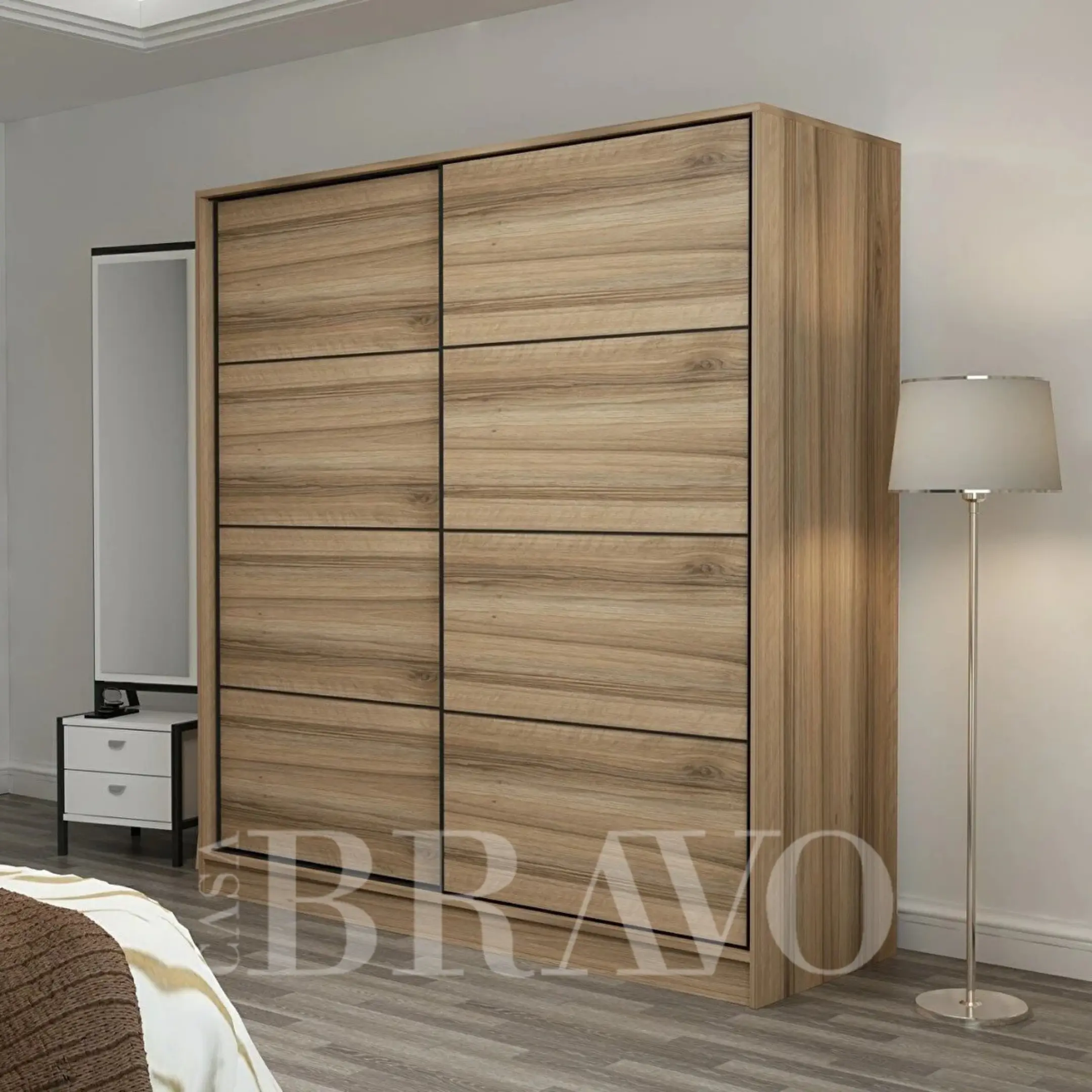 Crafted with a natural wood finish, it adds a warm and stylish touch to any bedroom decor. The sliding doors ensure smooth access while saving space, making it ideal for smaller rooms or modern apartments.
