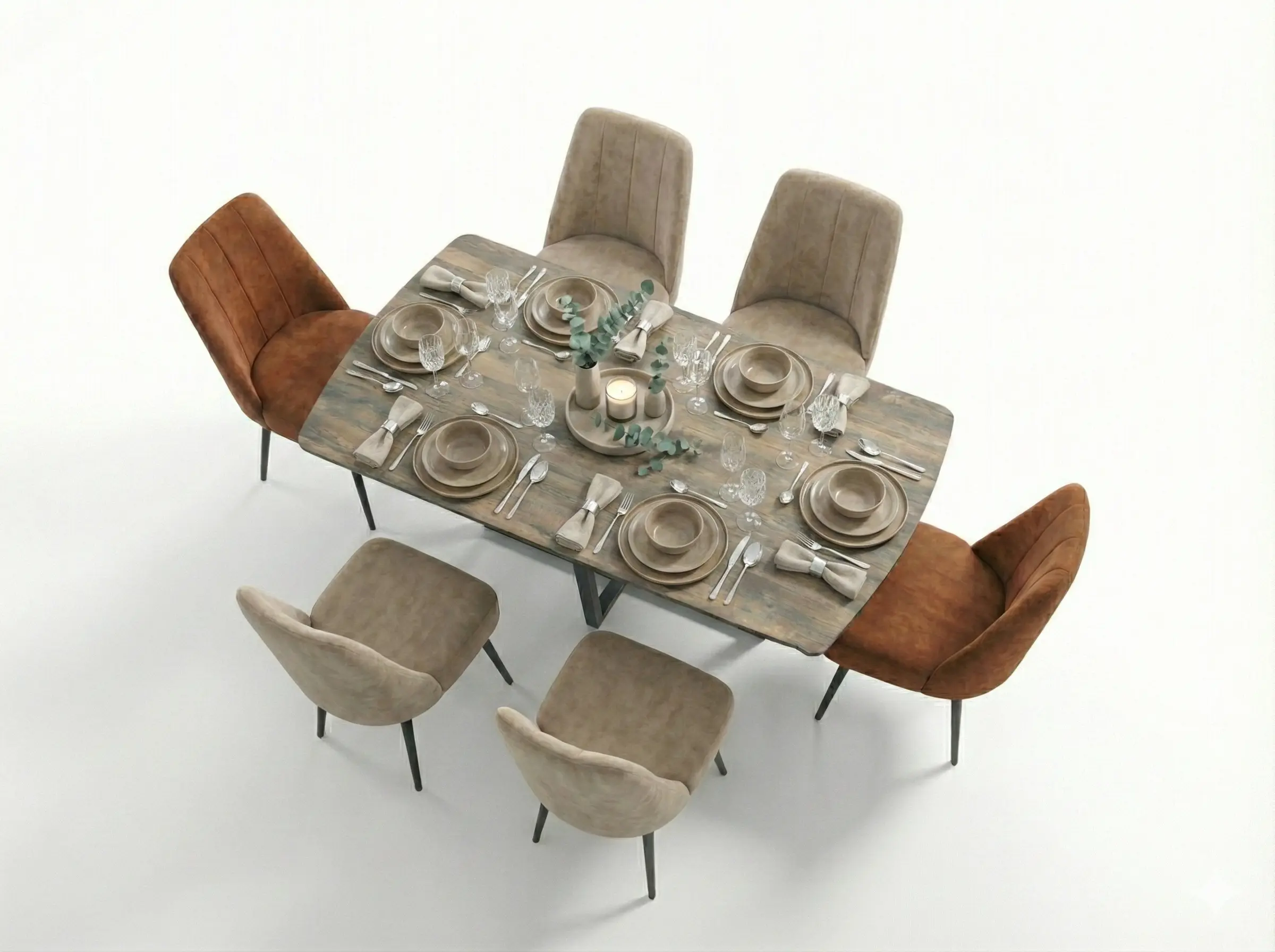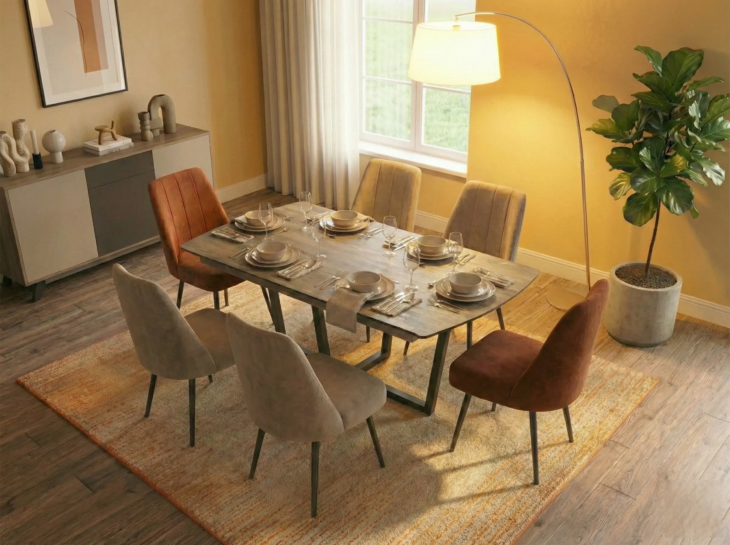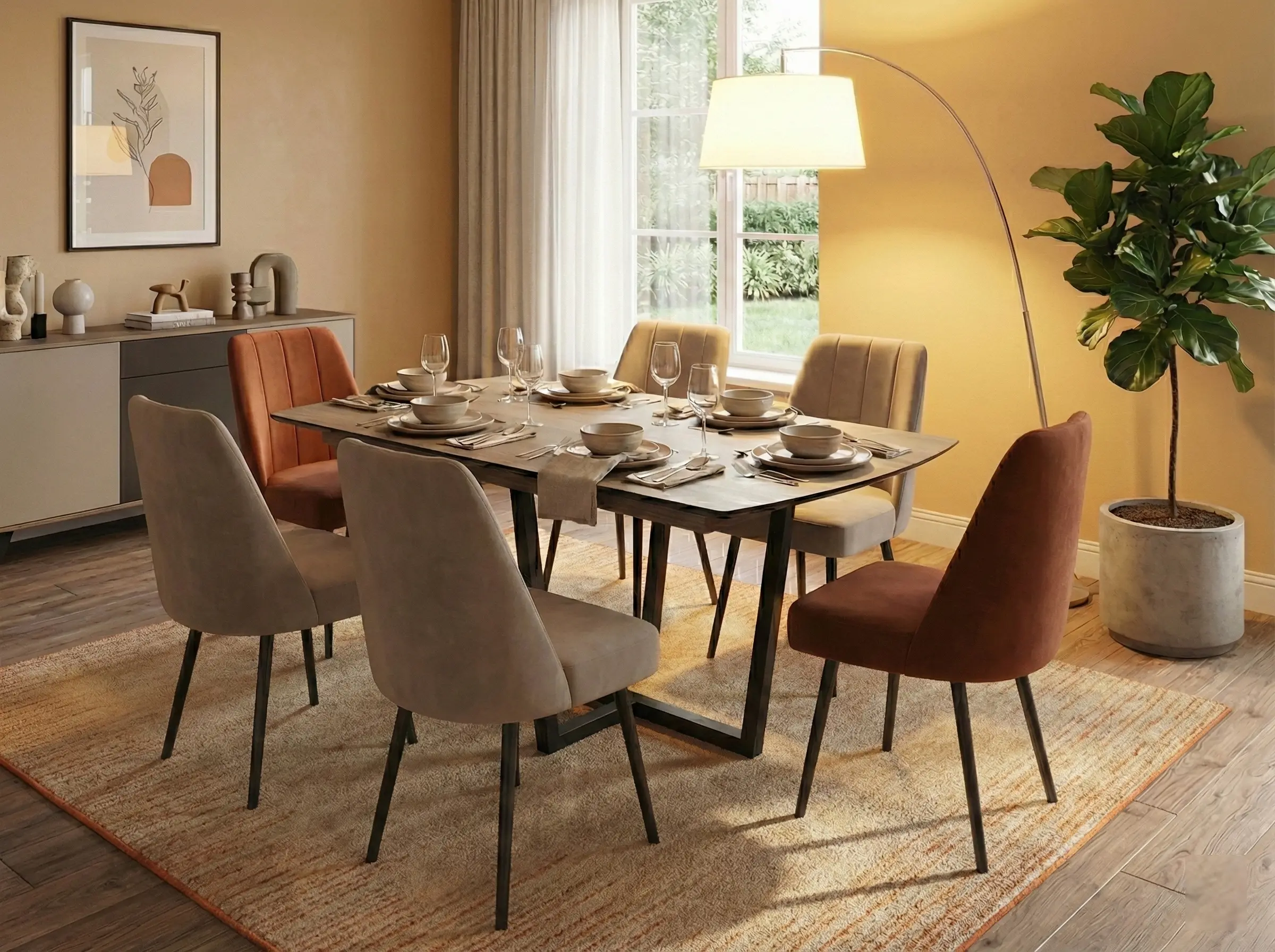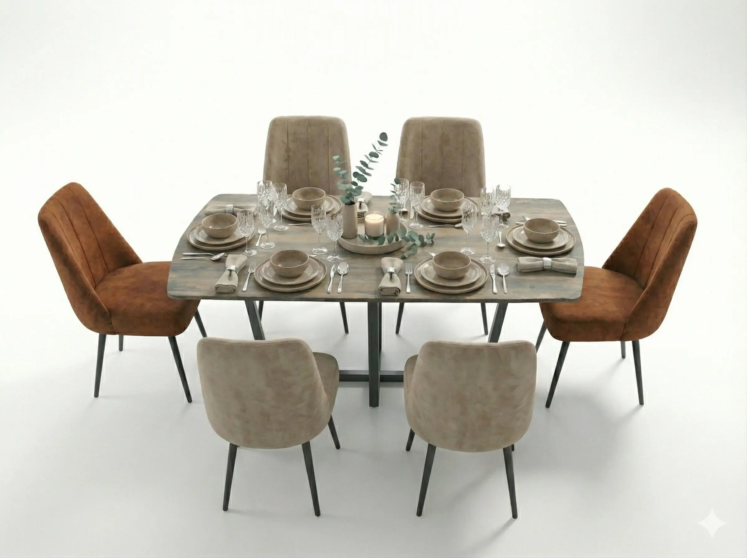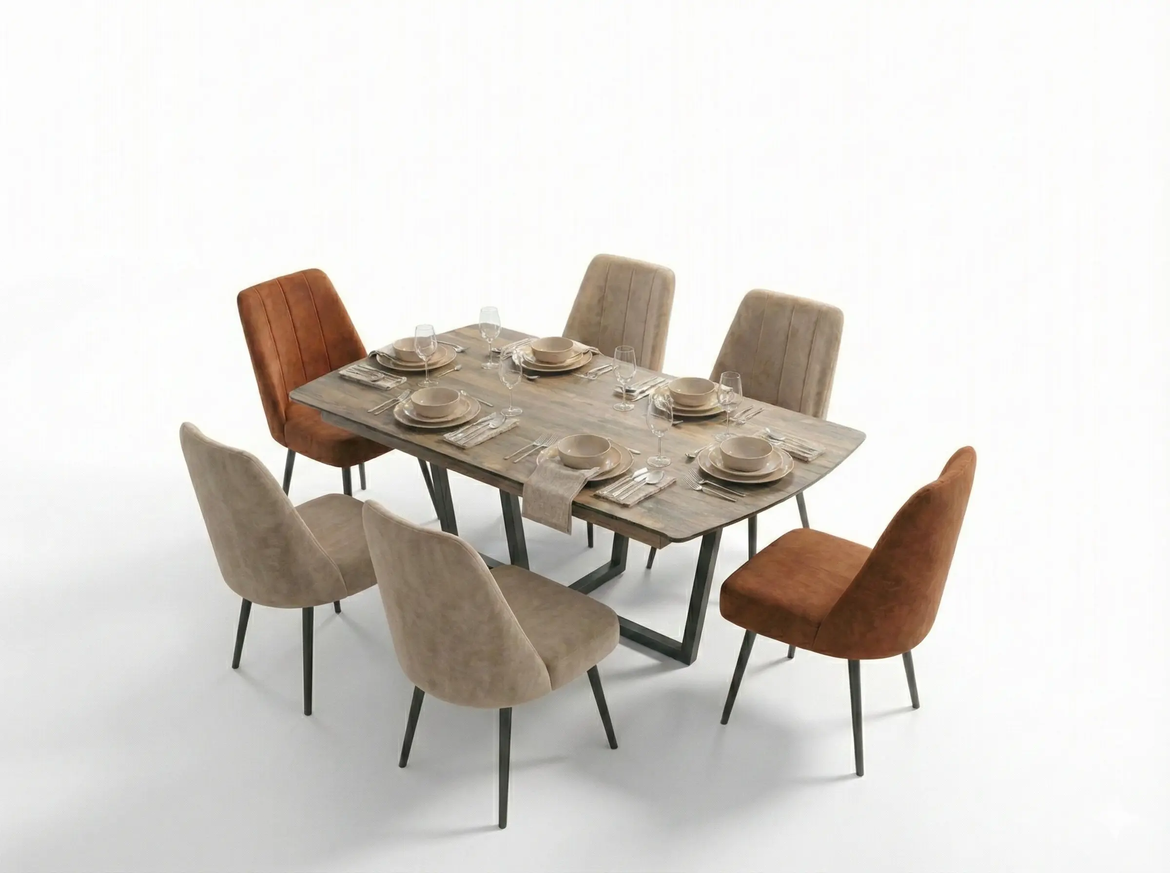 This is a sophisticated, rectangular dining set with Oval Ends featuring a tabletop with a natural wood look melamined high density wooden finish. The table is supported by black, mild steel base, lending it a clean, Mid-Century Modern influence. It pairs six dark upholstered chairs in two ctrasting colors, offering flexible and stylish seating for six in a compact arrangement.