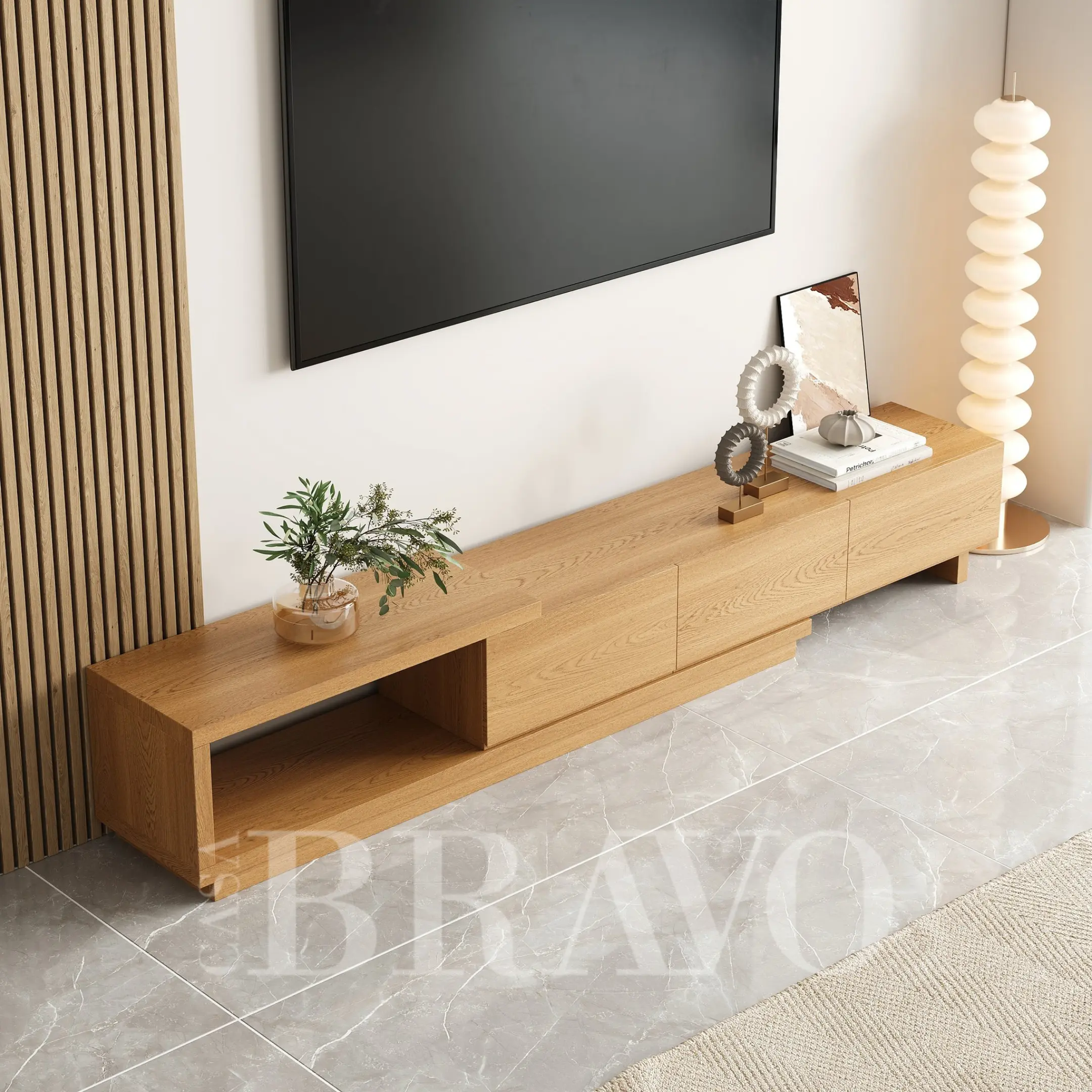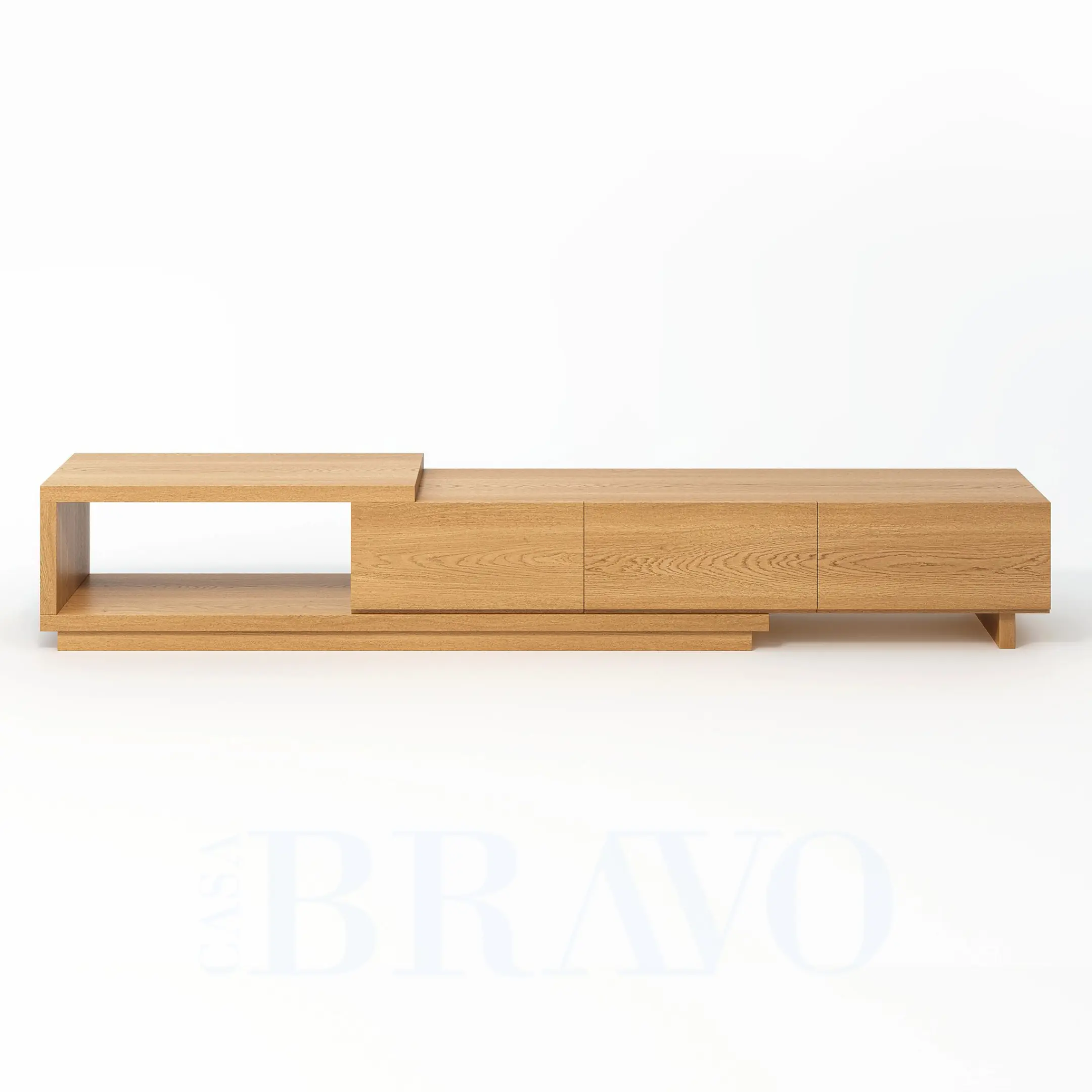 Crafted entirely in warm natural oak, this TV stand brings a clean, organic aesthetic to your living space. Its layered open-shelf design adds visual depth, while the three seamless drawers offer generous hidden storage for a clutter-free setup.