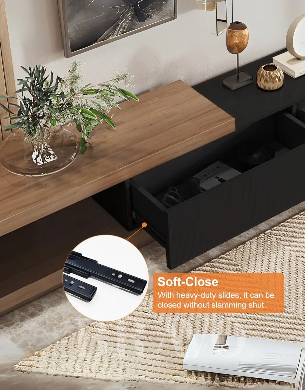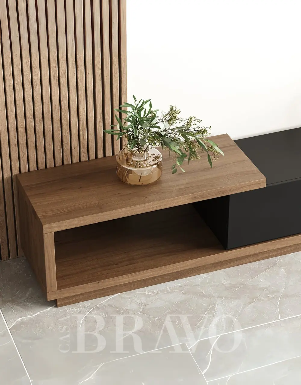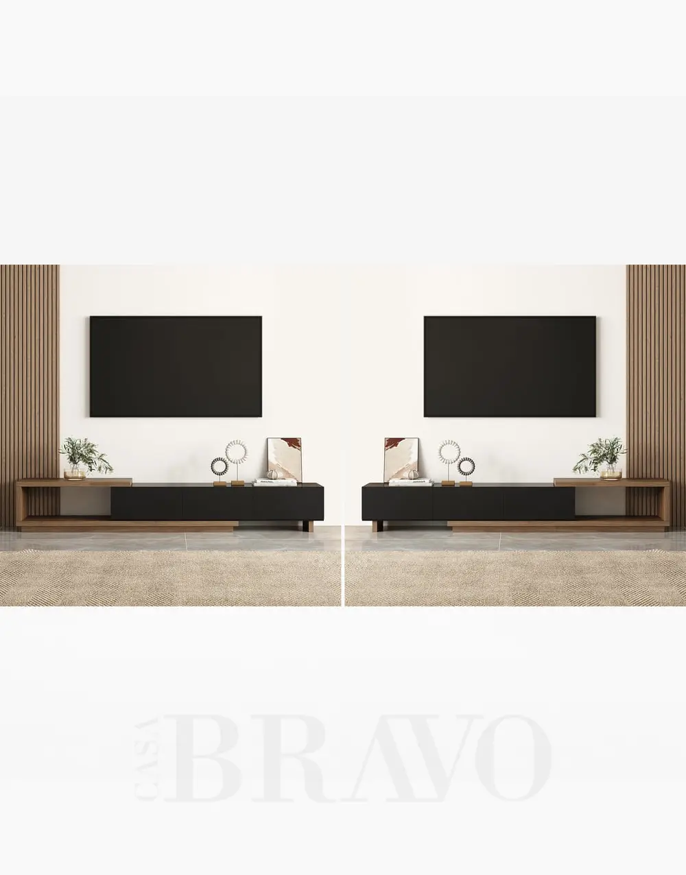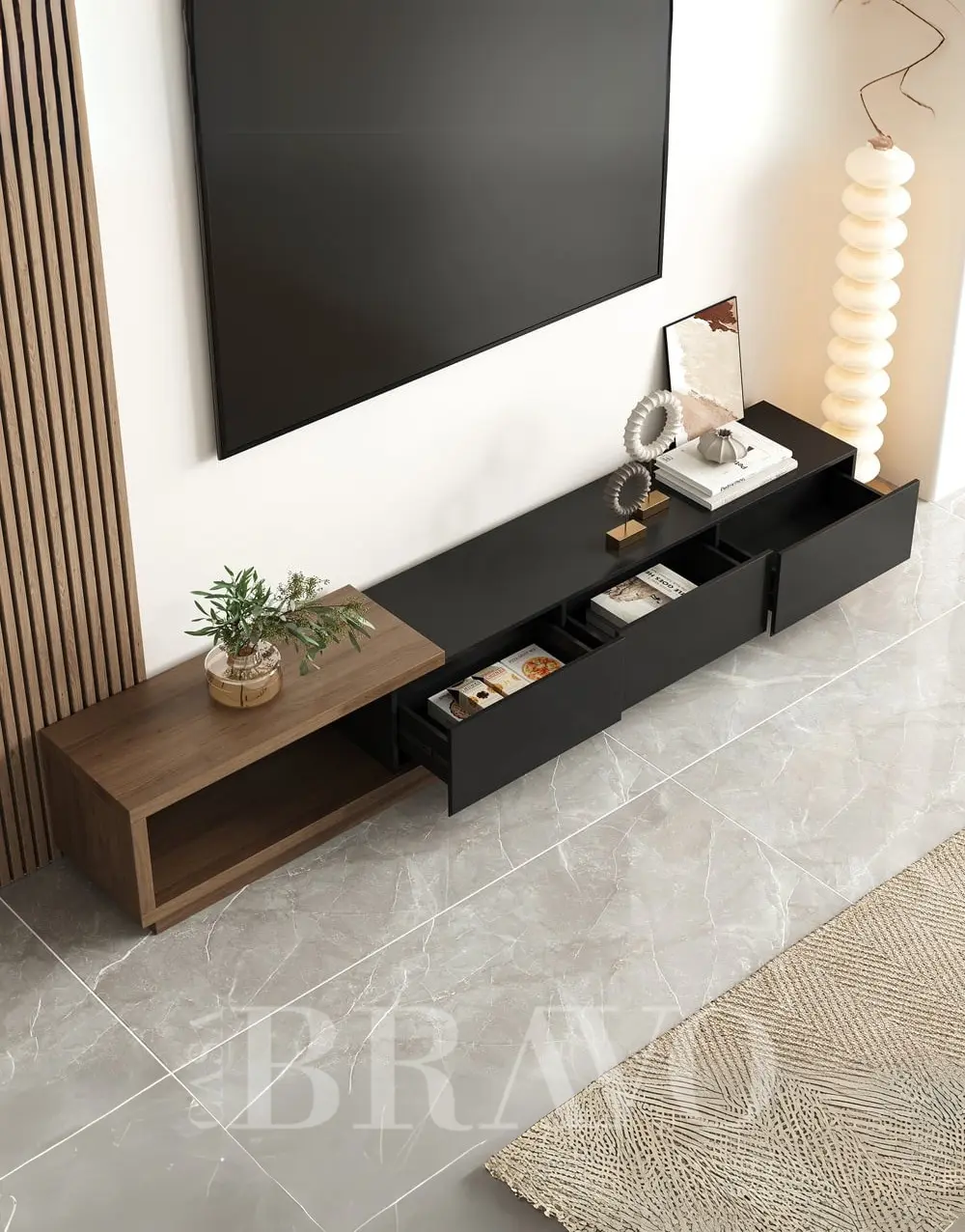 A sleek fusion of rich walnut wood and matte black fronts, this TV console delivers a bold Scandinavian-modern look. The open side shelf adds balance and display space, while the clean, handle-free drawers keep your living area refined and clutter-free.