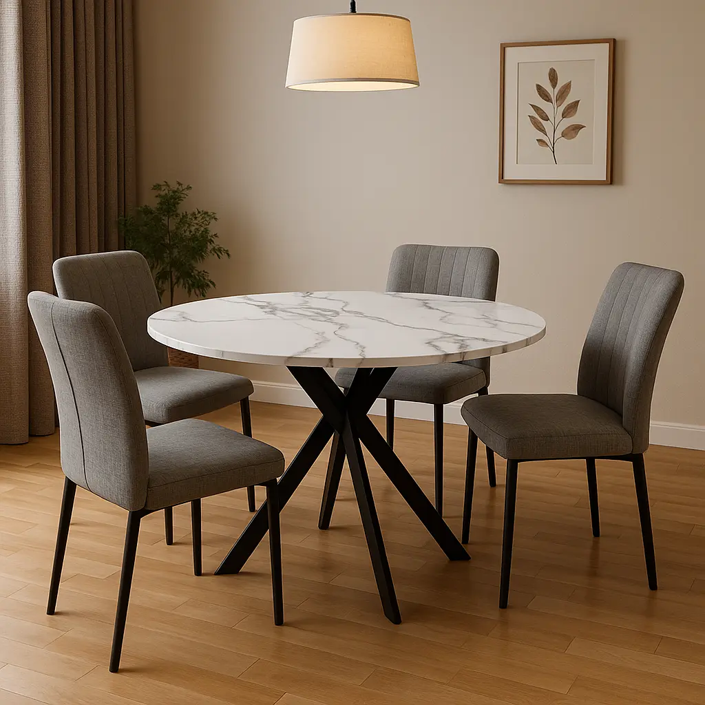 The table is complemented by four contemporary dining chairs that have a sleek, minimalist profile. The chairs feature off-white cushioned seats and backs and are supported by the same slender black metal legs. The chair backs have a subtle, integrated black frame detail that echoes the table’s leg color, creating a cohesive and stylish look.