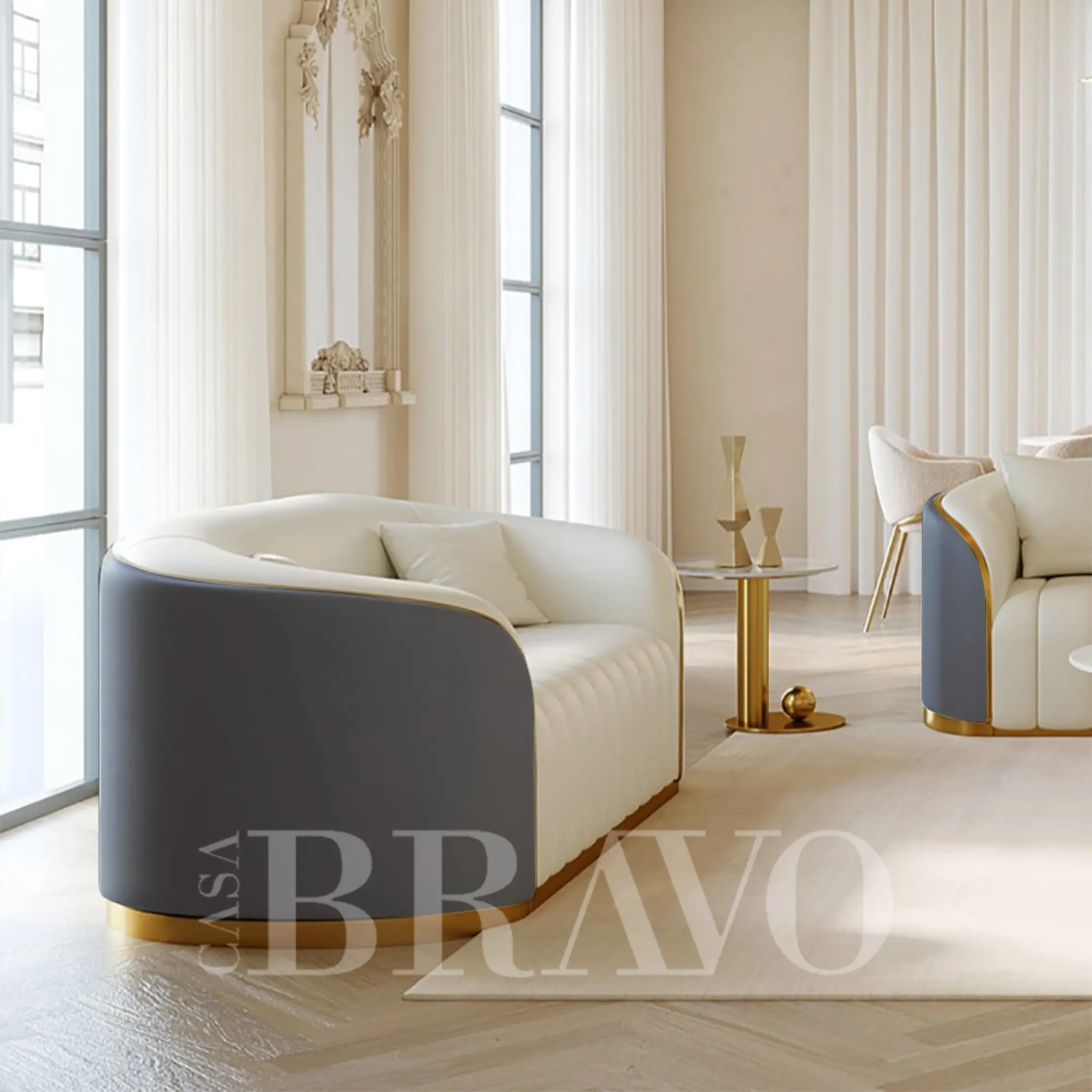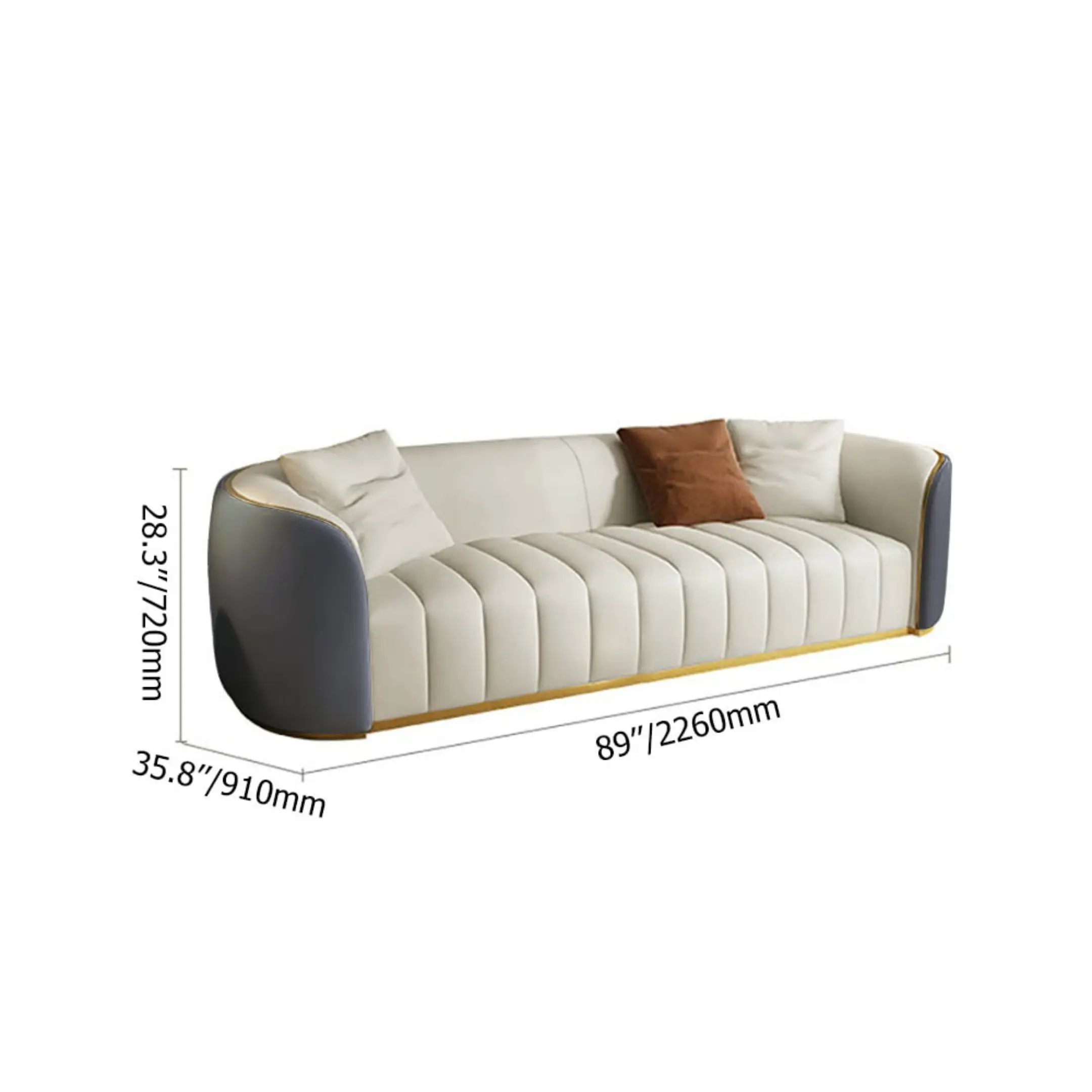 Experience elevated comfort with this contemporary three-seater sofa, designed to complement modern living spaces. The refined channel-tufted backrest adds depth and a sophisticated visual appeal, while the sleek metallic plinth base brings a subtle touch of modern glamour.