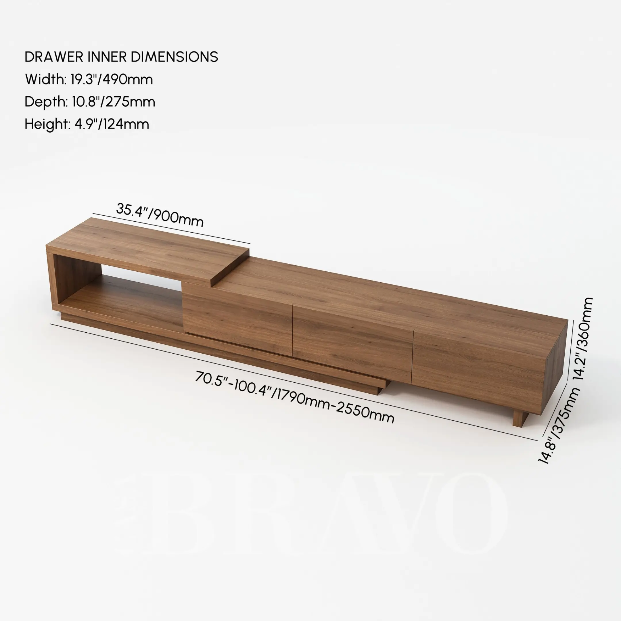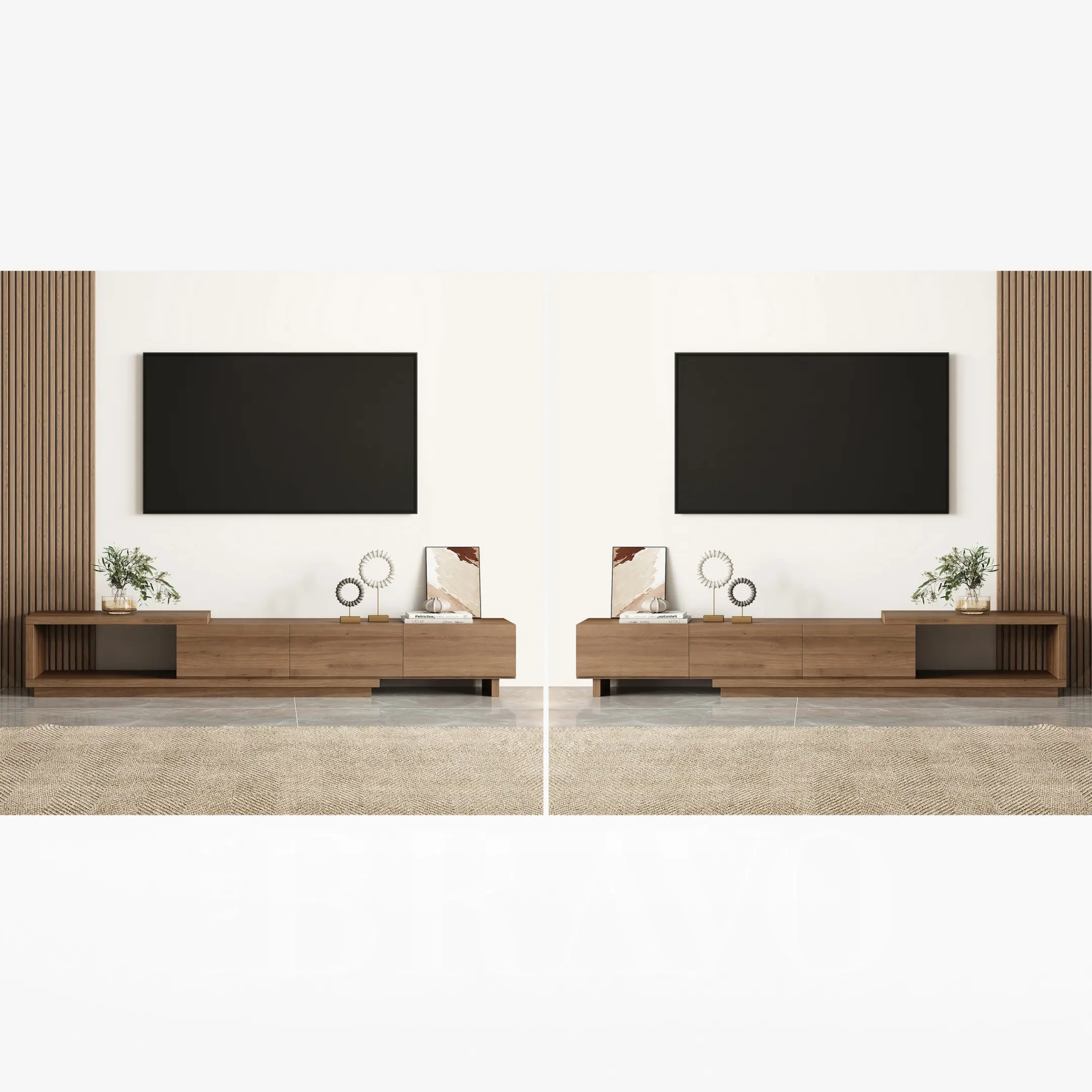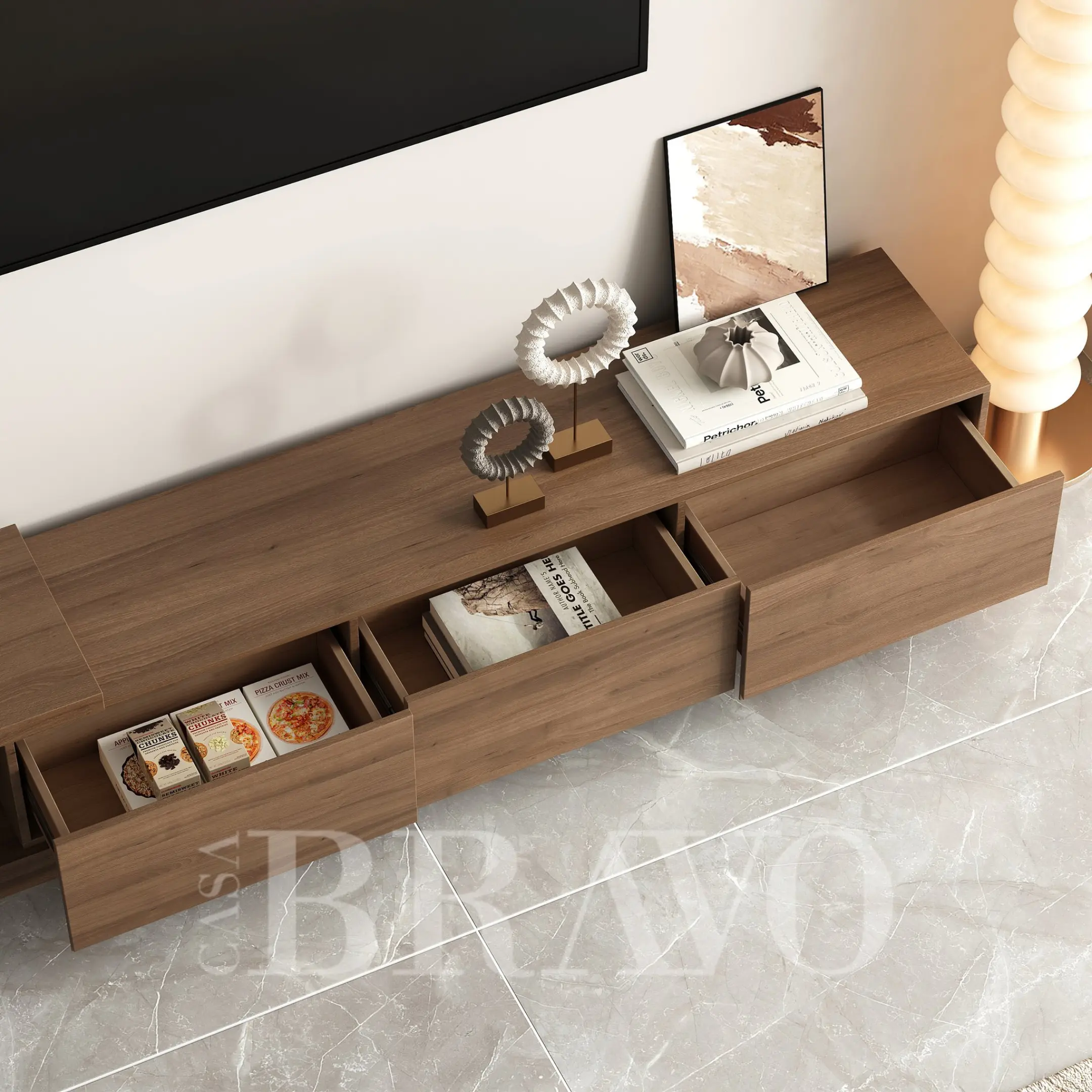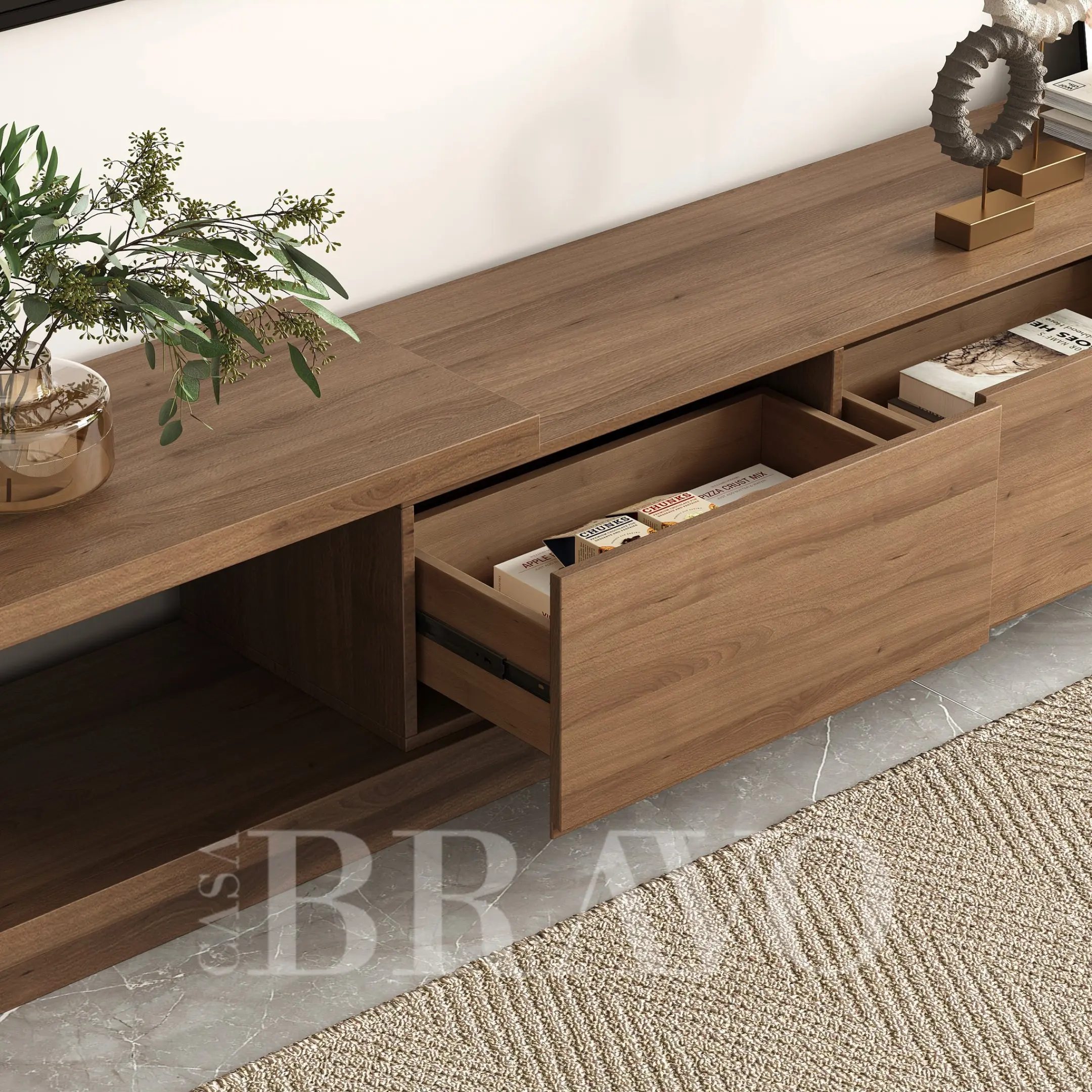 Designed with a warm natural walnut finish, this console blends clean lines with practical storage. The elevated side shelf offers space for décor or devices, while the smooth-glide drawers keep your essentials neatly tucked away for a clutter-free setup.