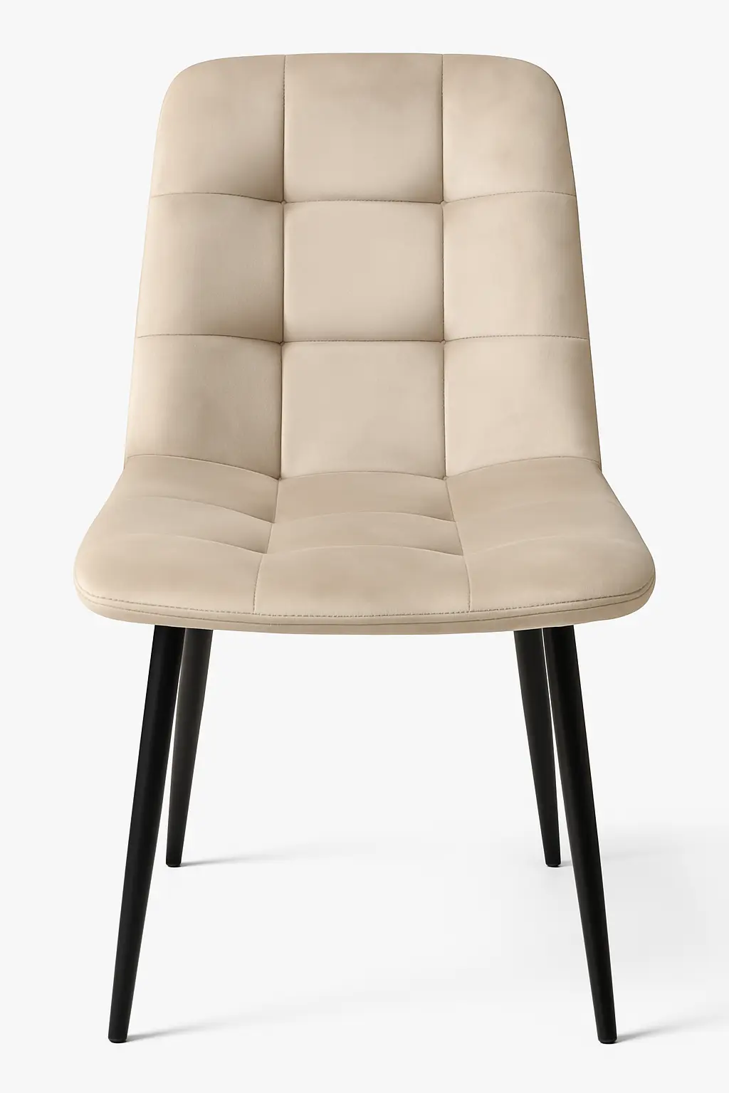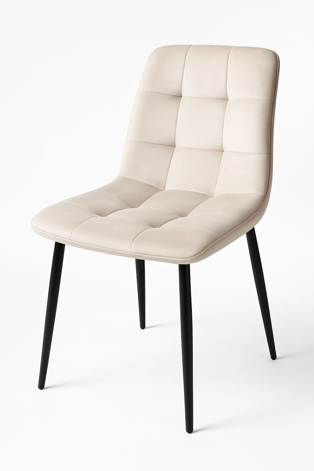 The Boxer Dining Chair features a comfortable, fully upholstered seat and back in a durable, textured light bige fabric. Its standout detail is the clean, square/box tufting, which provides visual structure and enhanced padding. The chair is finished with four signature tapered black metal legs, offering a contemporary contrast to the soft upholstery. This style is perfect for adding softness and a clean geometric pattern to a modern or Scandinavian-style dining space
