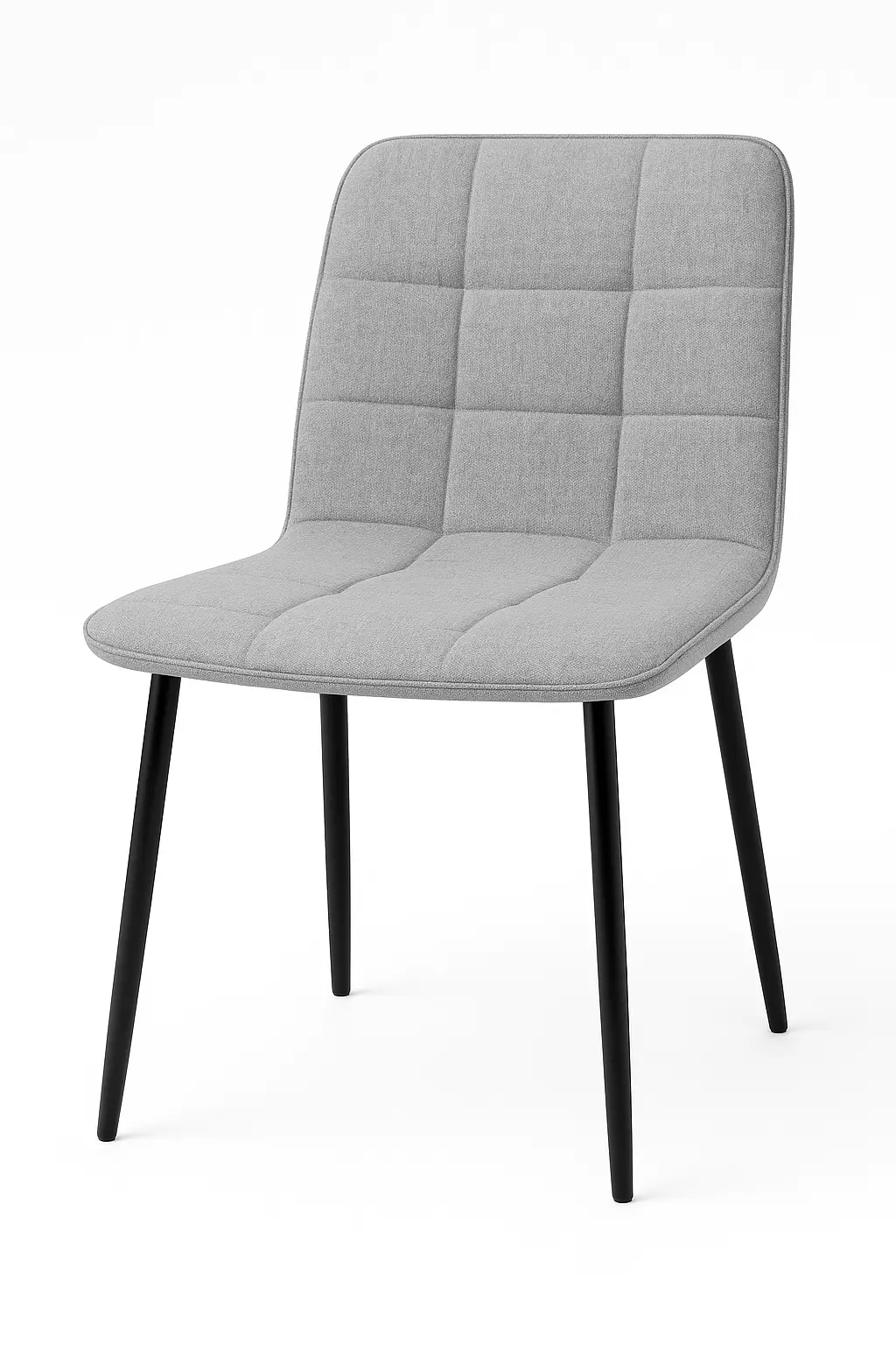 The Boxer Dining Chair features a comfortable, fully upholstered seat and back in a durable, textured light grey fabric. Its standout detail is the clean, square/box tufting, which provides visual structure and enhanced padding. The chair is finished with four signature tapered black metal legs, offering a contemporary contrast to the soft upholstery. This style is perfect for adding softness and a clean geometric pattern to a modern or Scandinavian-style dining space
