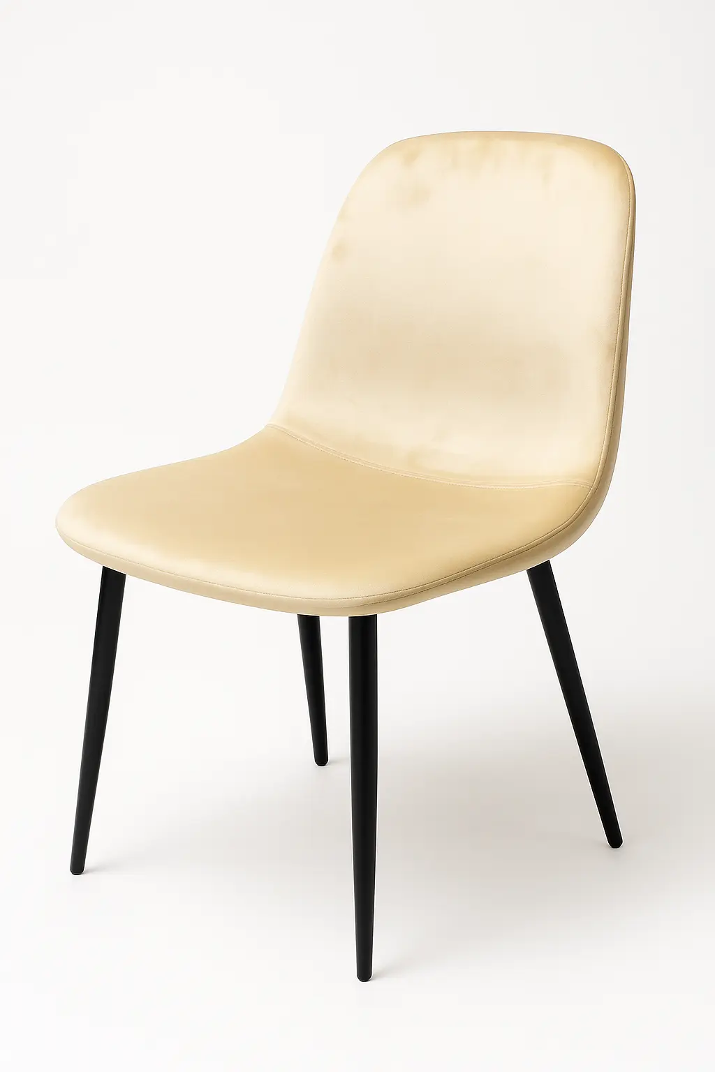 The Clara Dining Chair features a beautifully simple, contemporary shell design upholstered in a smooth, rich velvet fabric in a lovely pale champagne hue. It foregoes any tufting or detailing, letting the luxurious sheen of the velvet and the chair’s sculpted form stand out. Supported by sleek, tapered matte black legs, this chair is a versatile option for adding a touch of sophisticated, understated glamour to any modern dining setting.