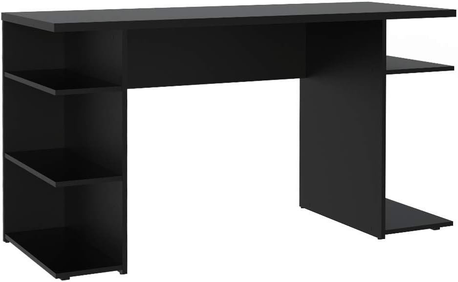 This is a minimalist, compact desk finished entirely in clean white. Its design is characterized by a sleek, rectangular work surface and an integrated, two-tier open shelving unit on the left side, which acts as a supportive side panel. This shelving unit is perfect for storing books, magazines, or stationery, making it an excellent space-saving solution for students or for use in small apartments, providing a dedicated work area with convenient, accessible storage.