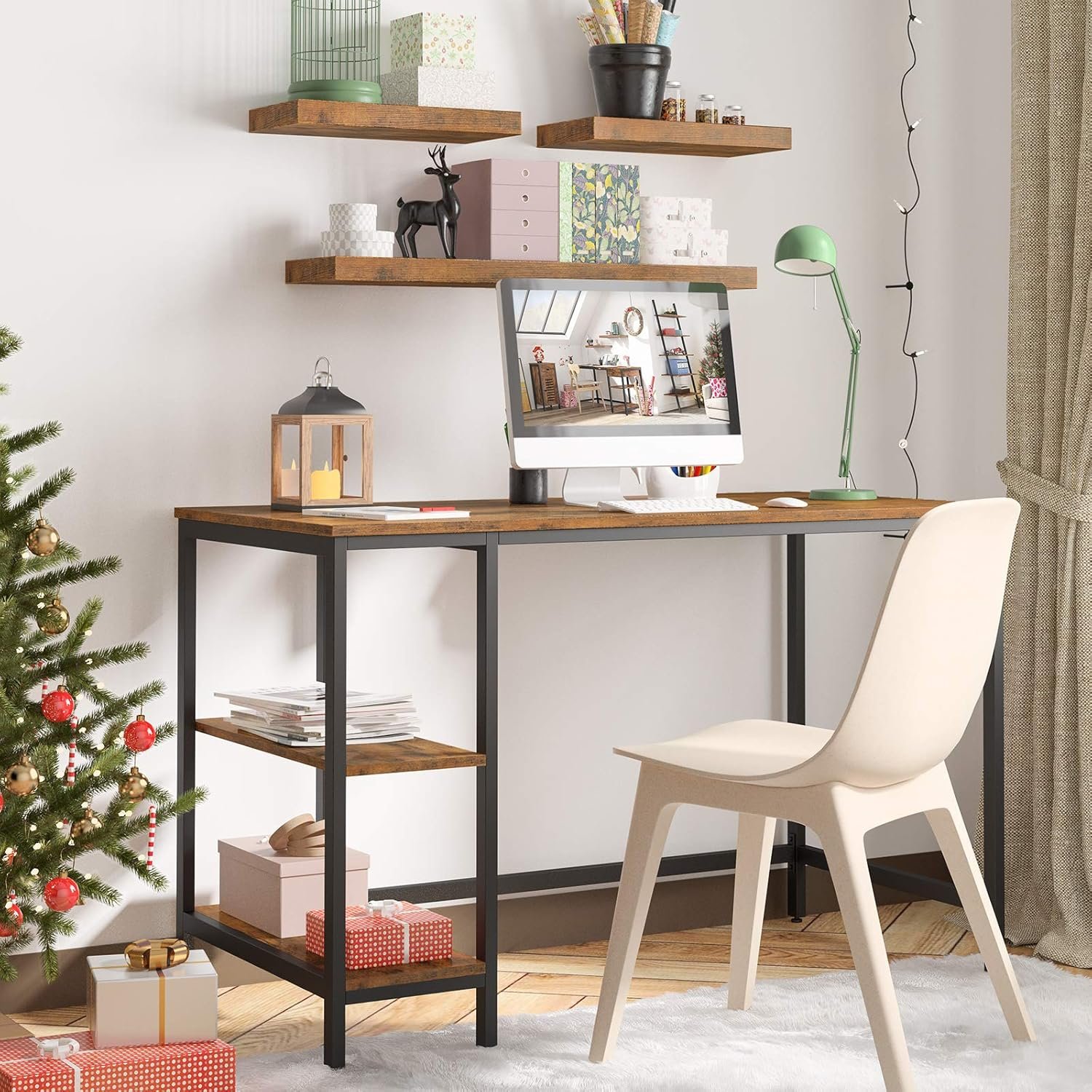 This desk features a rustic brown wood-grain finish and a sturdy black metal frame, giving it an industrial or farmhouse aesthetic. It is defined by its compact size (47.2″ or 120 text{ Cm} wide) and its practical, two-tier open shelving unit integrated into the left side. These shelves (11.6″ and 10″ of vertical space) are perfect for storing books, stationery, or a small printer, making it an efficient workspace for studying or computing in smaller areas. The open leg design on the right side maximizes comfort