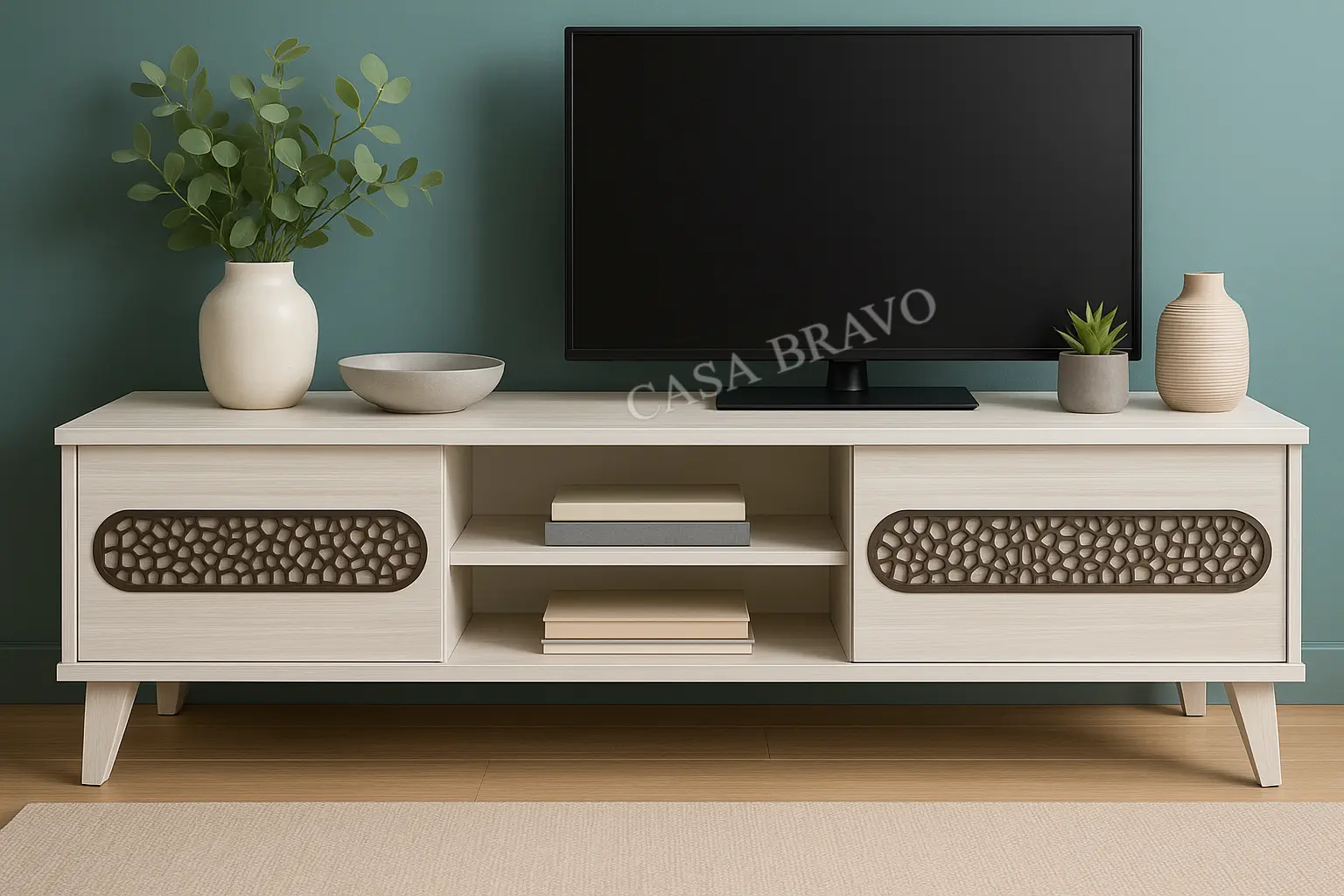 This is a modern, low-profile TV stand featuring a sleek, all-white finish. It includes a spacious open central shelf and two closed storage compartments. The standout element is the oval-shaped, dark lattice or cane-style geometric pattern integrated into the face of each cabinet door, providing a contrasting textural detail. This piece maintains a calming, highly stylish contemporary aesthetic and is supported by four subtle, angled white legs.