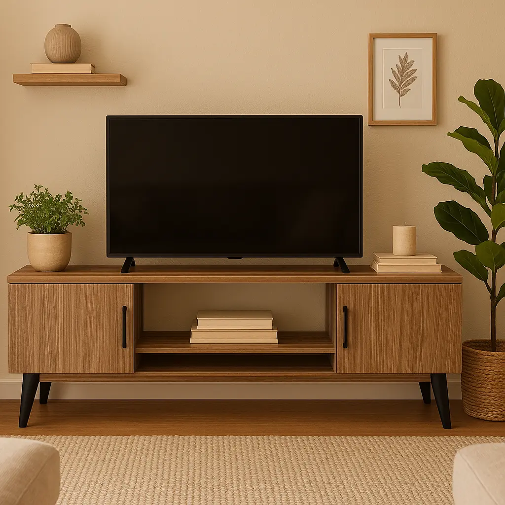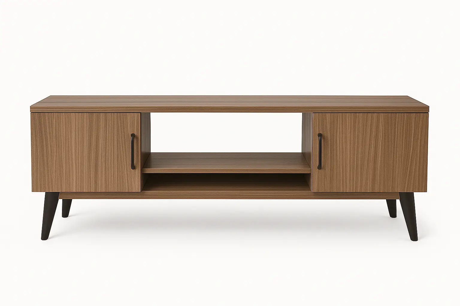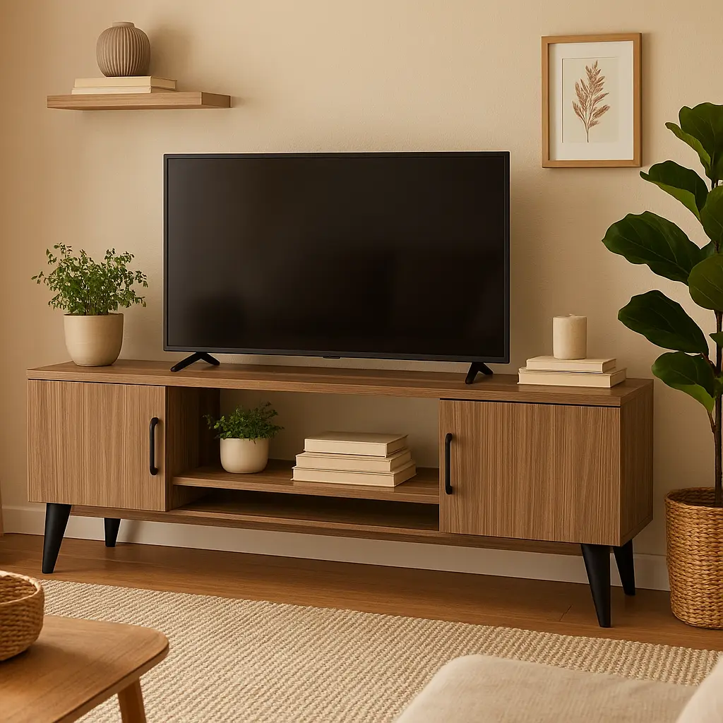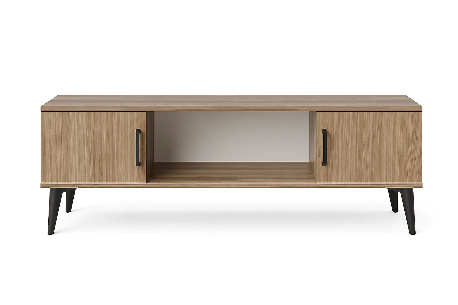 This is a sleek, low-profile media console or TV stand featuring a beautiful medium-toned wood-grain finish throughout, with a contrasting element of black tapered legs and black bar handles. It offers generous storage with a central open shelf for media components and two closed cabinets on either side. Its clean lines and mixed materials give it a warm, inviting, yet definitively modern style suitable for most living spaces.
