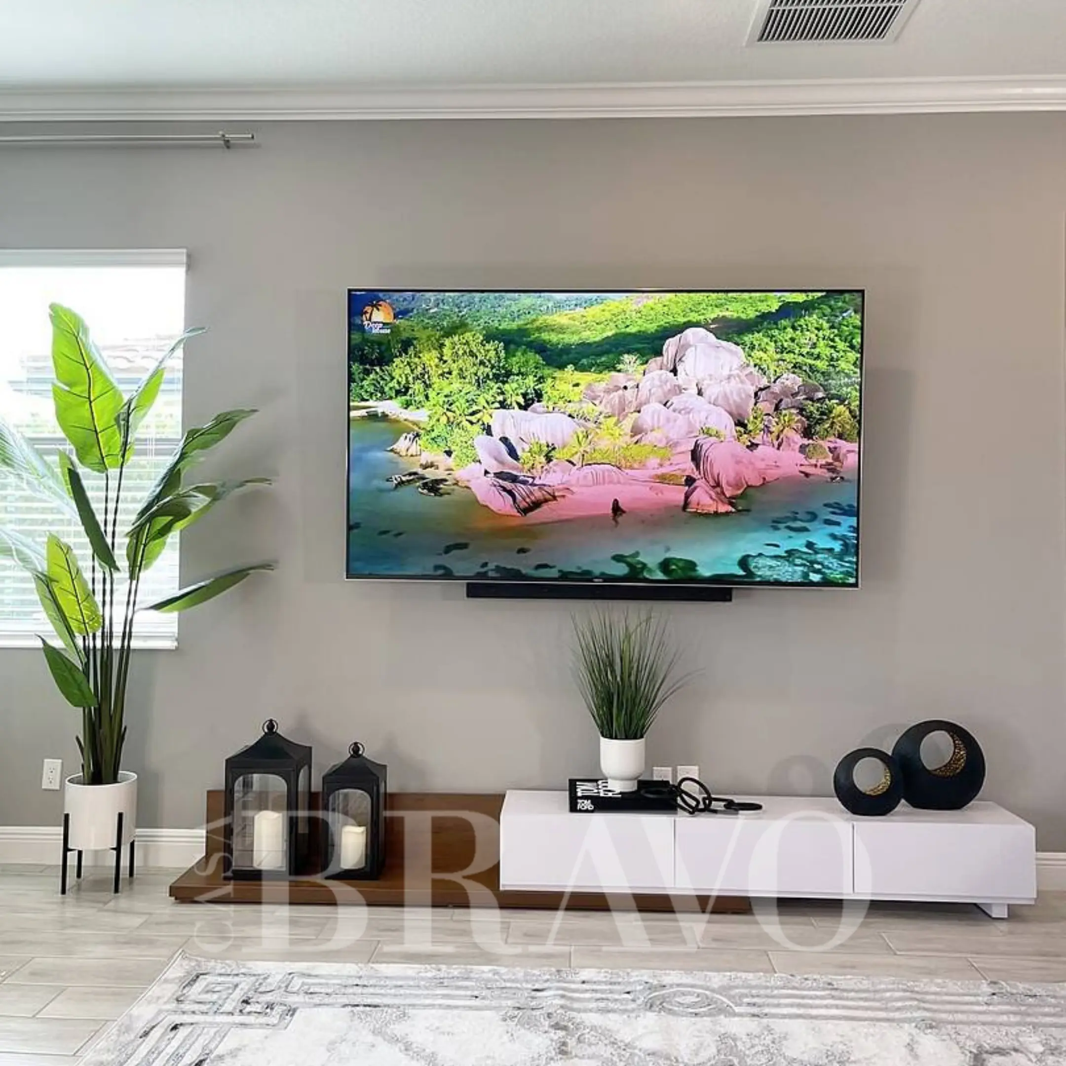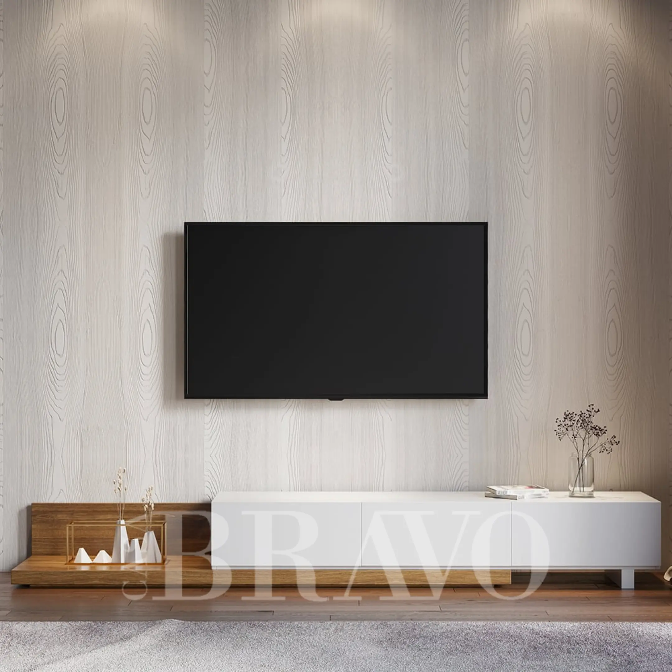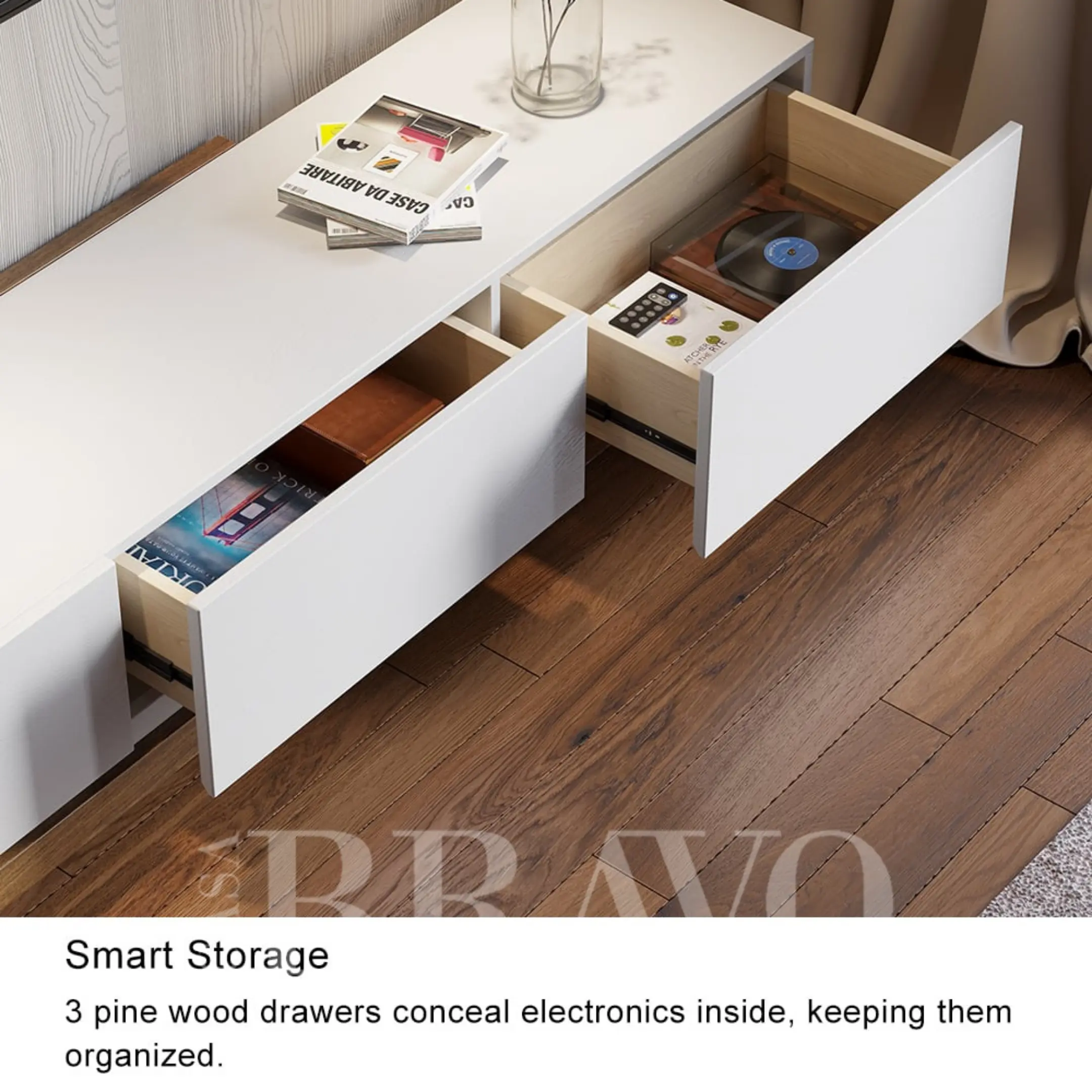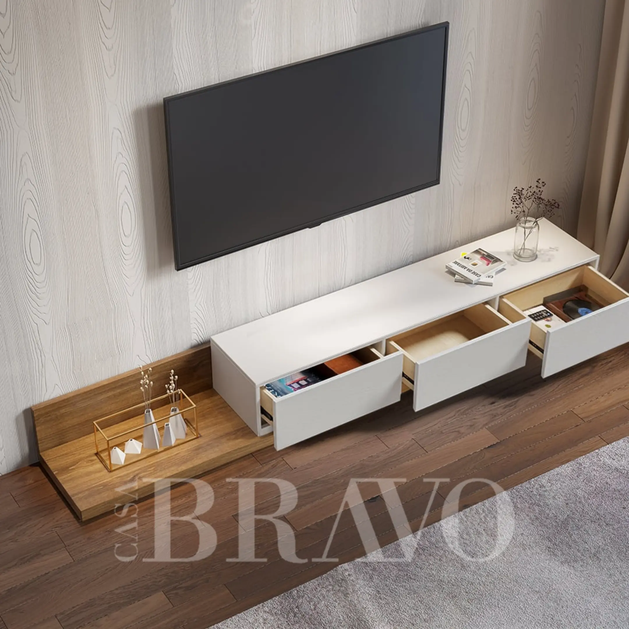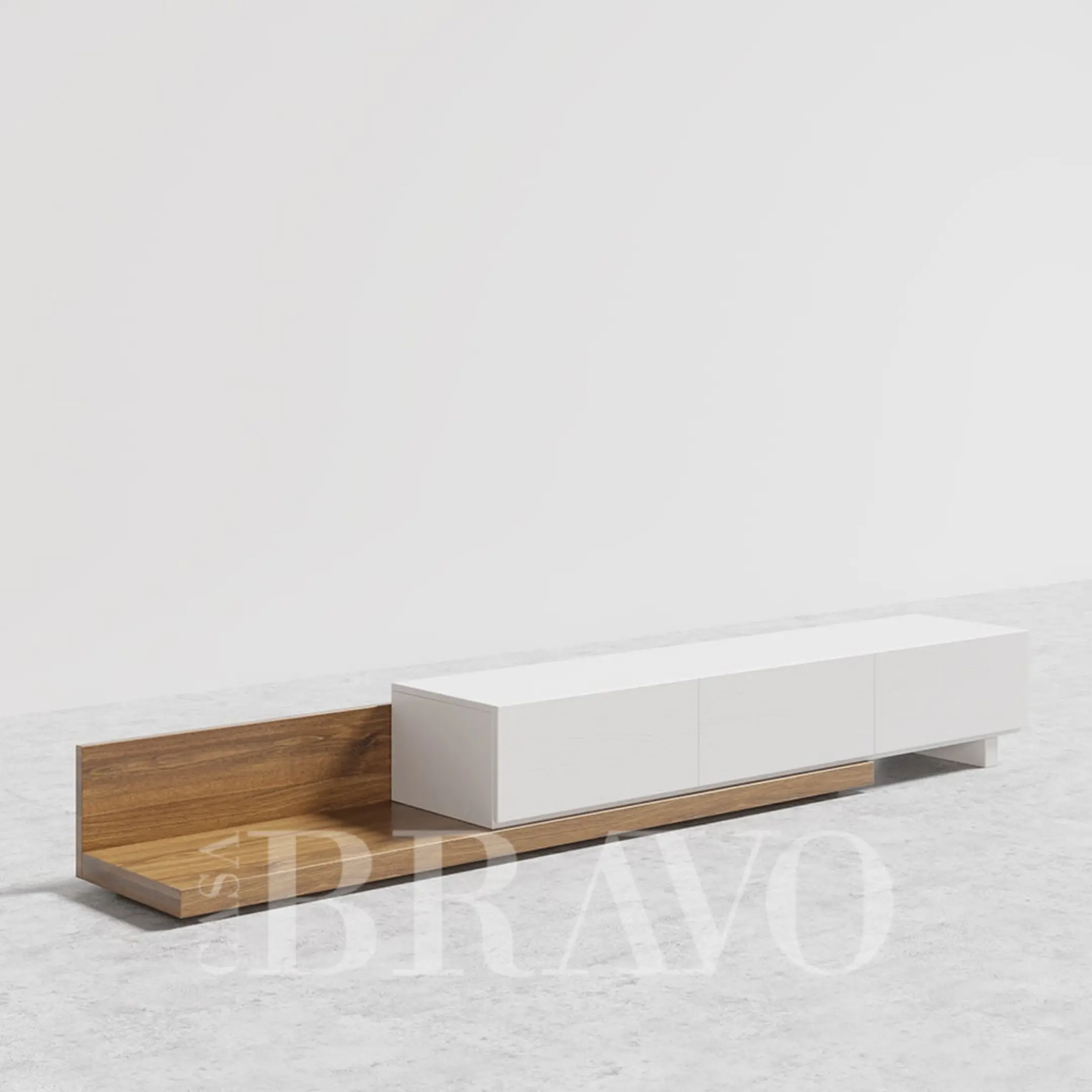 This is an expansive, modern media console designed with a striking floating aesthetic. It features a primary, low-profile, white rectangular cabinet that provides hidden storage through sleek, handleless drawers. A wide, integrated wood-grained shelf or backing panel extends horizontally from the side, giving the piece a dramatic, two-tone, built-in look. The clean lines and mix of materials make it a sophisticated focal point for a large, contemporary living space.
