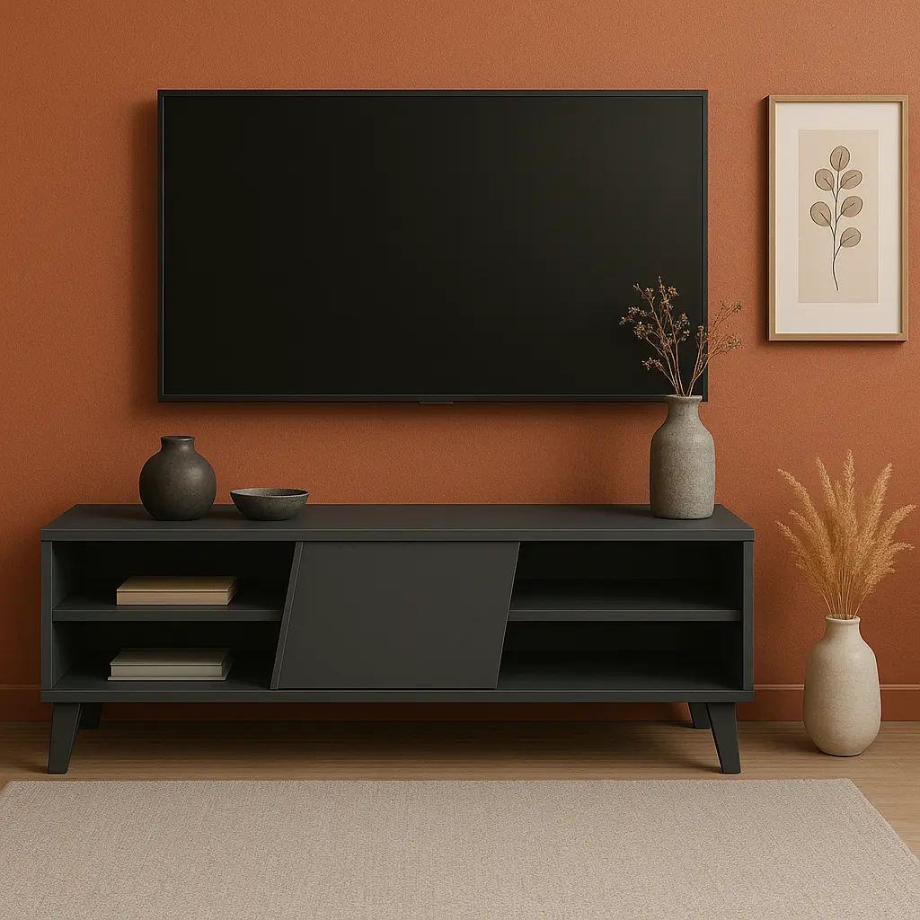 .This is a modern, low-profile media console or TV stand finished in clean white. The design features two symmetrical open shelving sections and a distinctive central closed storage compartment covered by an angled sliding panel. It is supported by four subtle, tapered legs, lending it a clean, minimalist Mid-Century Modern aesthetic, perfect for providing functional media storage and a neat appearance in a contemporary living room.