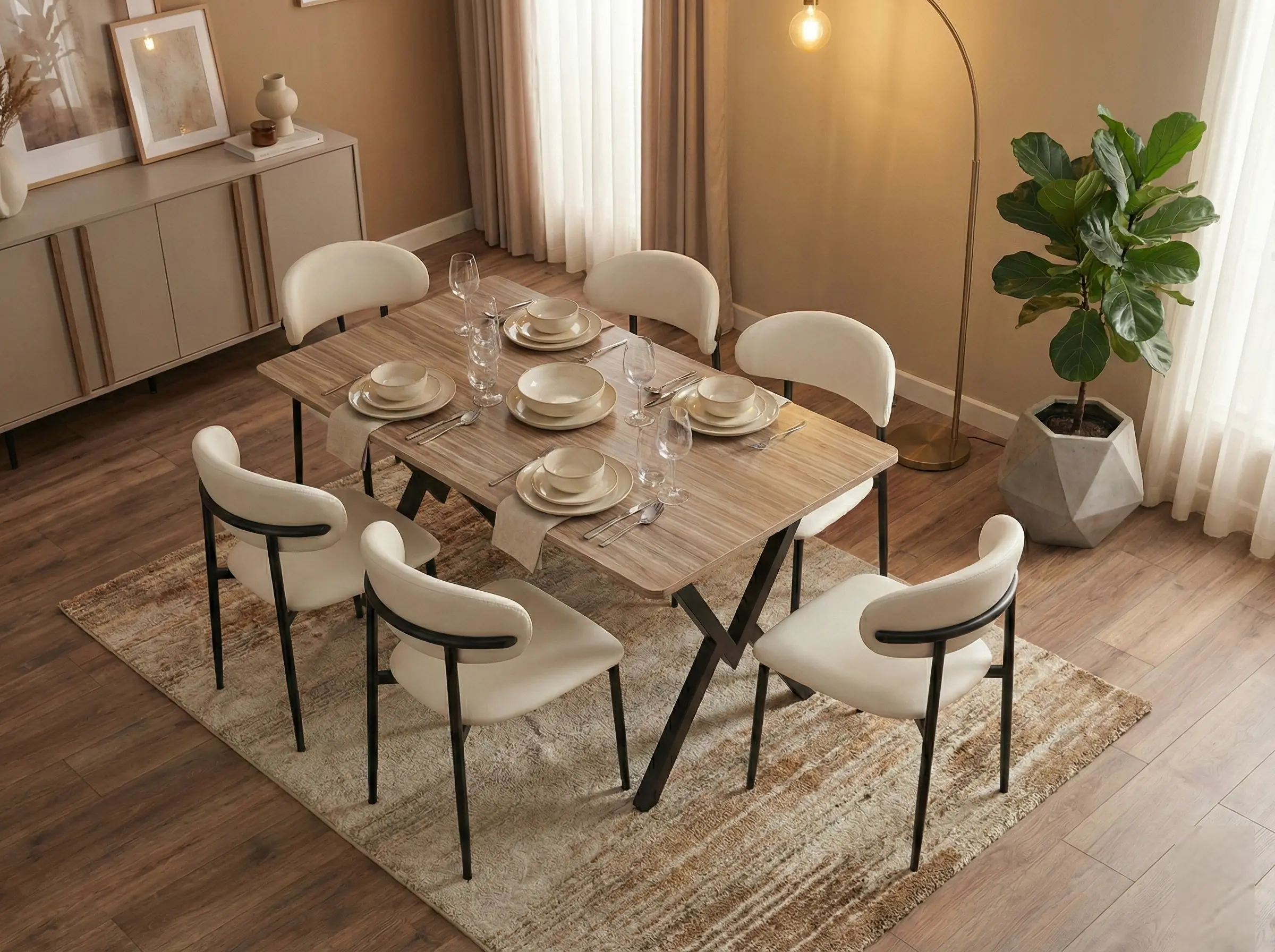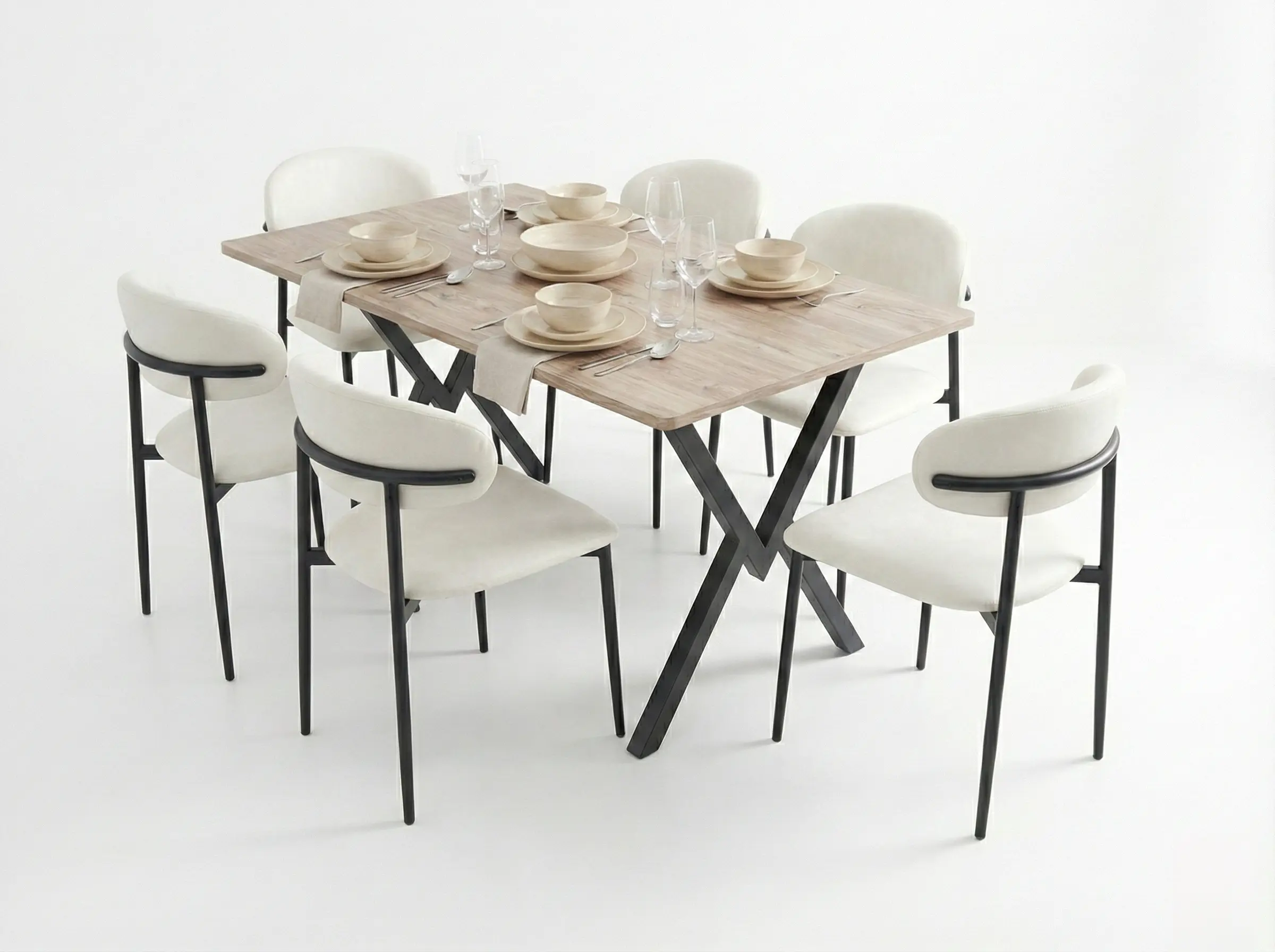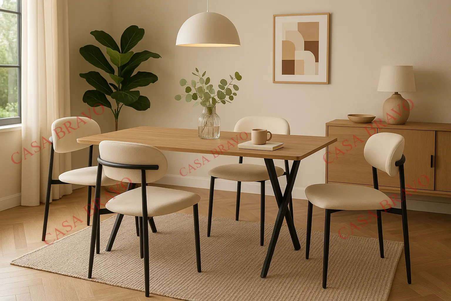 lending it a rustic or warm feel. It is supported by a modern, geometric black metal base that forms an angled trestle design, giving the piece a subtle industrial or contemporary edge. It is pictured with six easy clean upholstered chairs in a pale neutral beige color with black frame, offering a sophisticated contrast to the dark table.