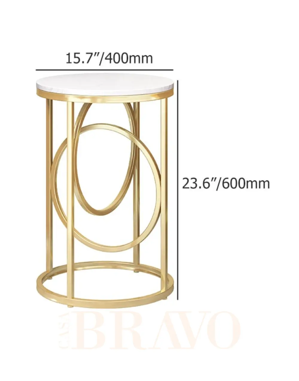 The frame’s defining characteristic is the interlocking, asymmetrical ring design set within the vertical supports, creating a visually dynamic, luxurious, and artistic focal point. This table is perfect for adding a touch of Art Deco glamour and functional flair as a side table in a living room, or as a chic nightstand in a bedroom.