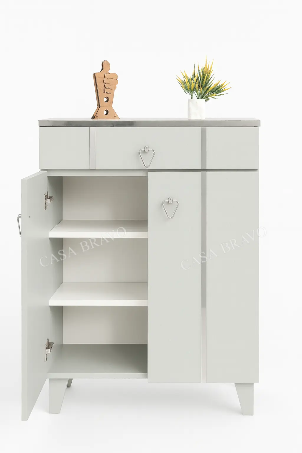 * Storage: It includes a shallow top drawer with a unique heart-shaped (or ring) pull, perfect for keys and accessories. Below, two hinged doors open to reveal two fixed internal shelves for organizing shoes and other items.