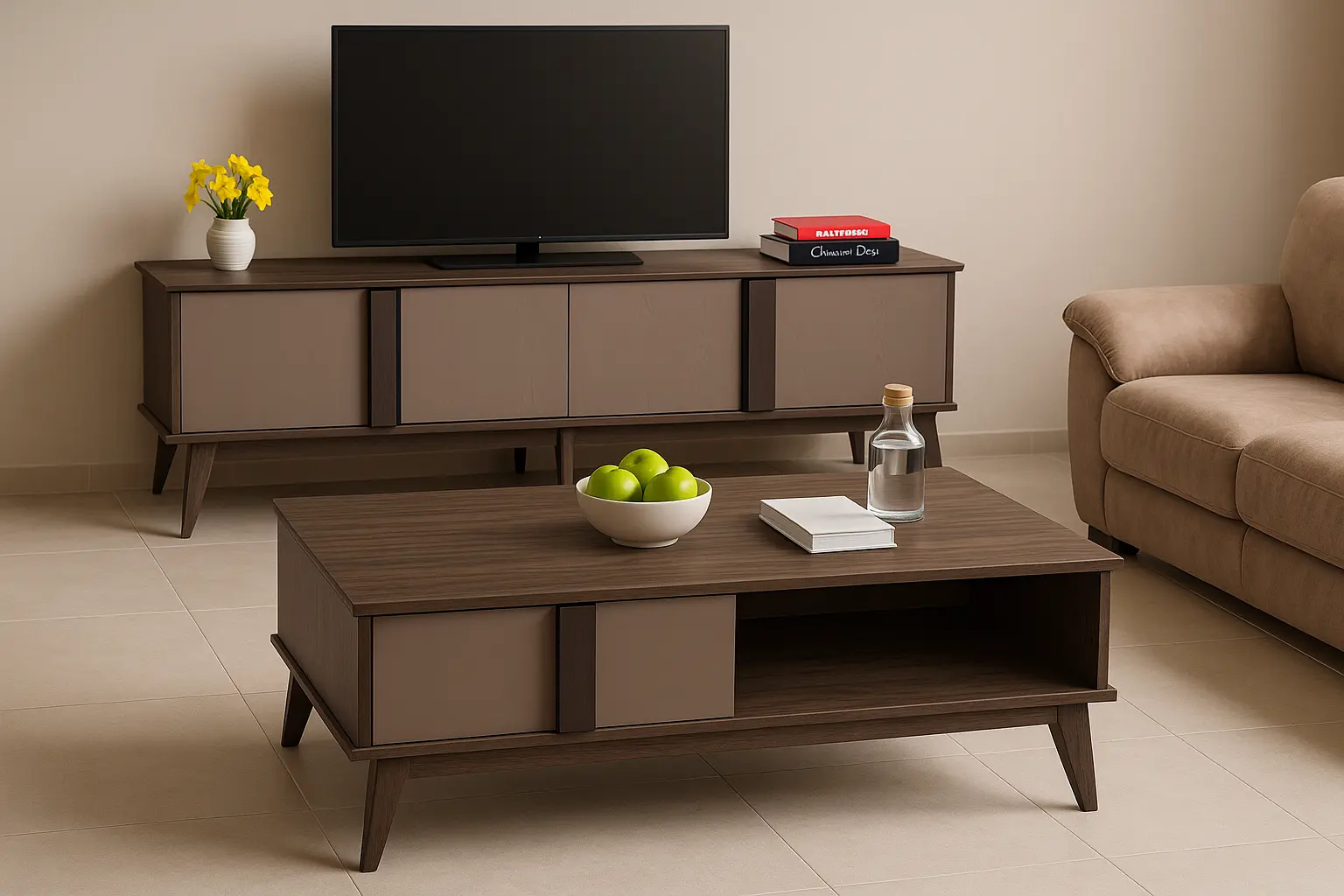 * Description: A long, low console that visually mirrors the coffee table. It uses the same wood grain finish and tapered legs and features a series of doors or drawers with the matching contrasting taupe accent color. The design is streamlined and low-profile, ideal for mounting a television above it.