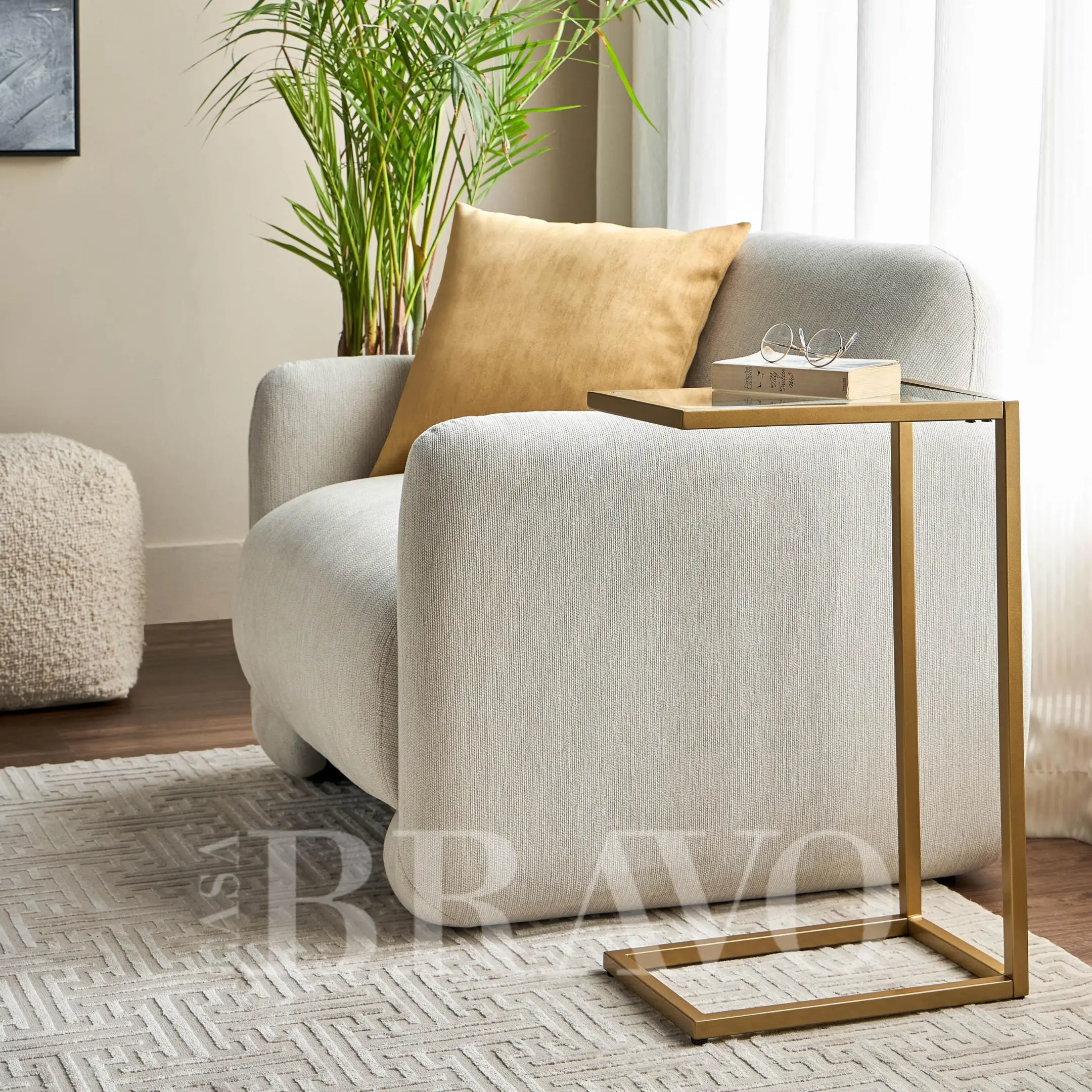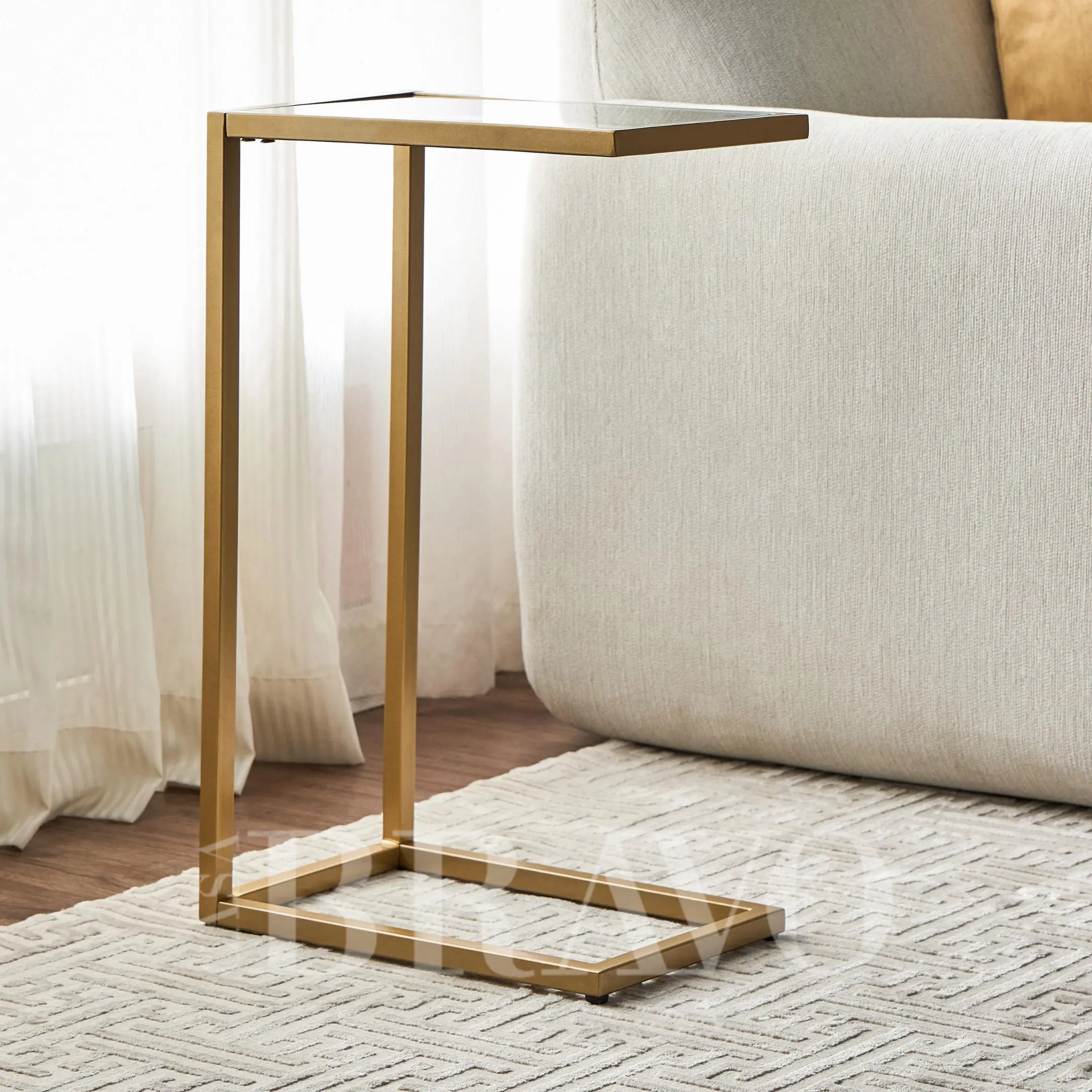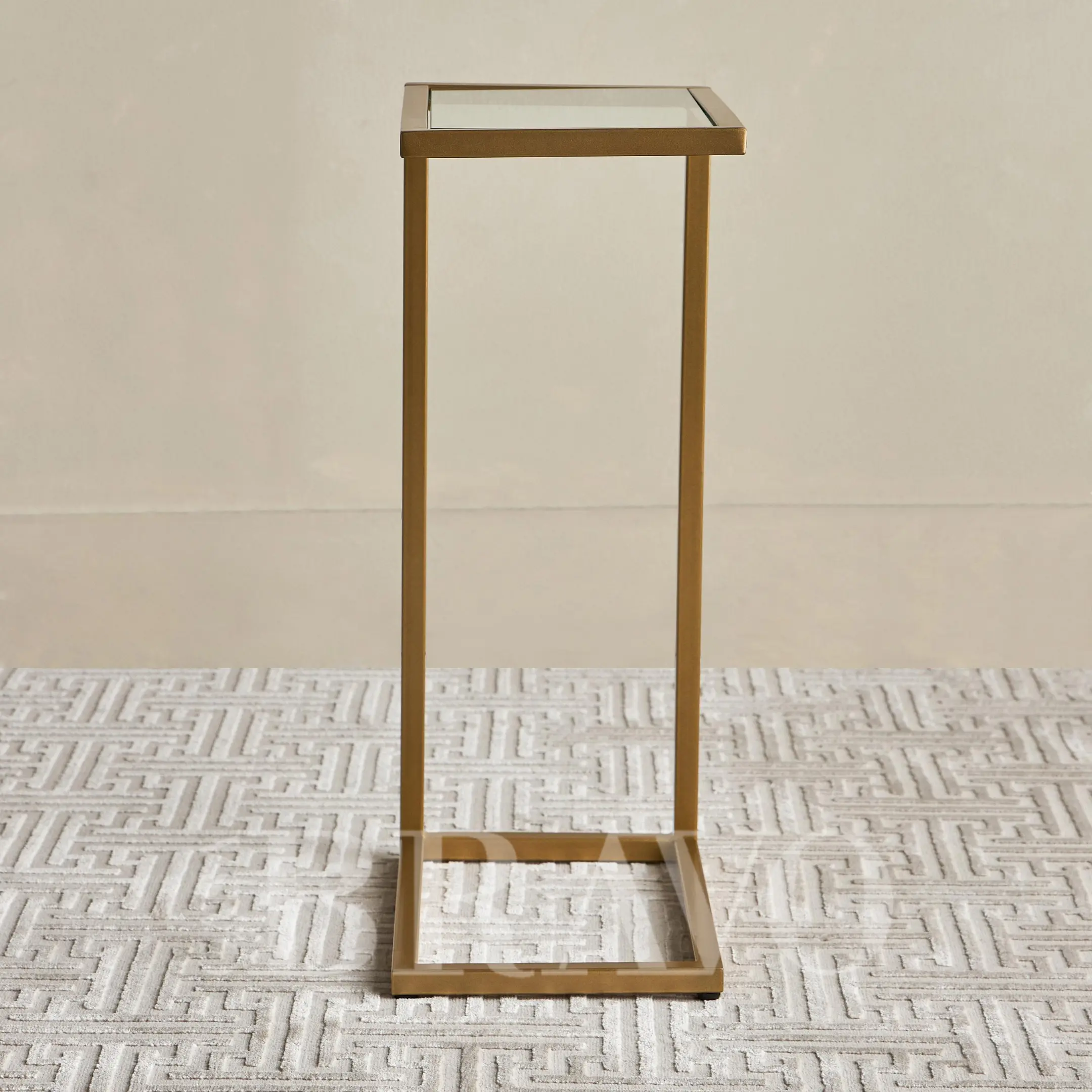 The Zenith Slim C-Table showcases a refined, minimalist aesthetic. It consists of a slender, continuous gold-finished metal frame supporting a clear glass or mirrored top (it appears clear in the image). The open, airy C-frame design ensures stability while maintaining a virtually invisible profile, making it a perfect functional accessory in a bright, modern setting