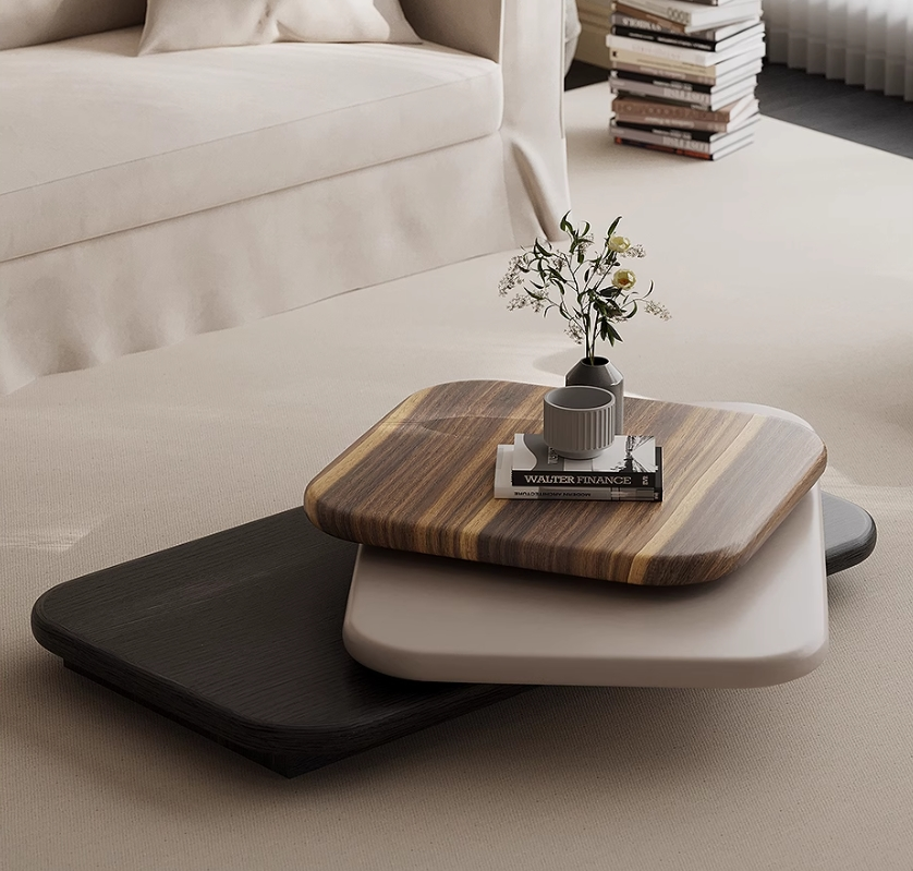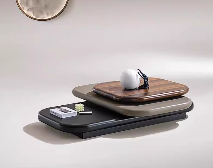 The Trio Elevate Center Table is a modern sculptural piece featuring three layered platforms in rich walnut, soft taupe, and deep charcoal finishes. Its floating, stepped design creates a dynamic centerpiece that blends organic warmth with minimalist elegance. Perfect for stylish living rooms, it offers both visual interest and functional display space.