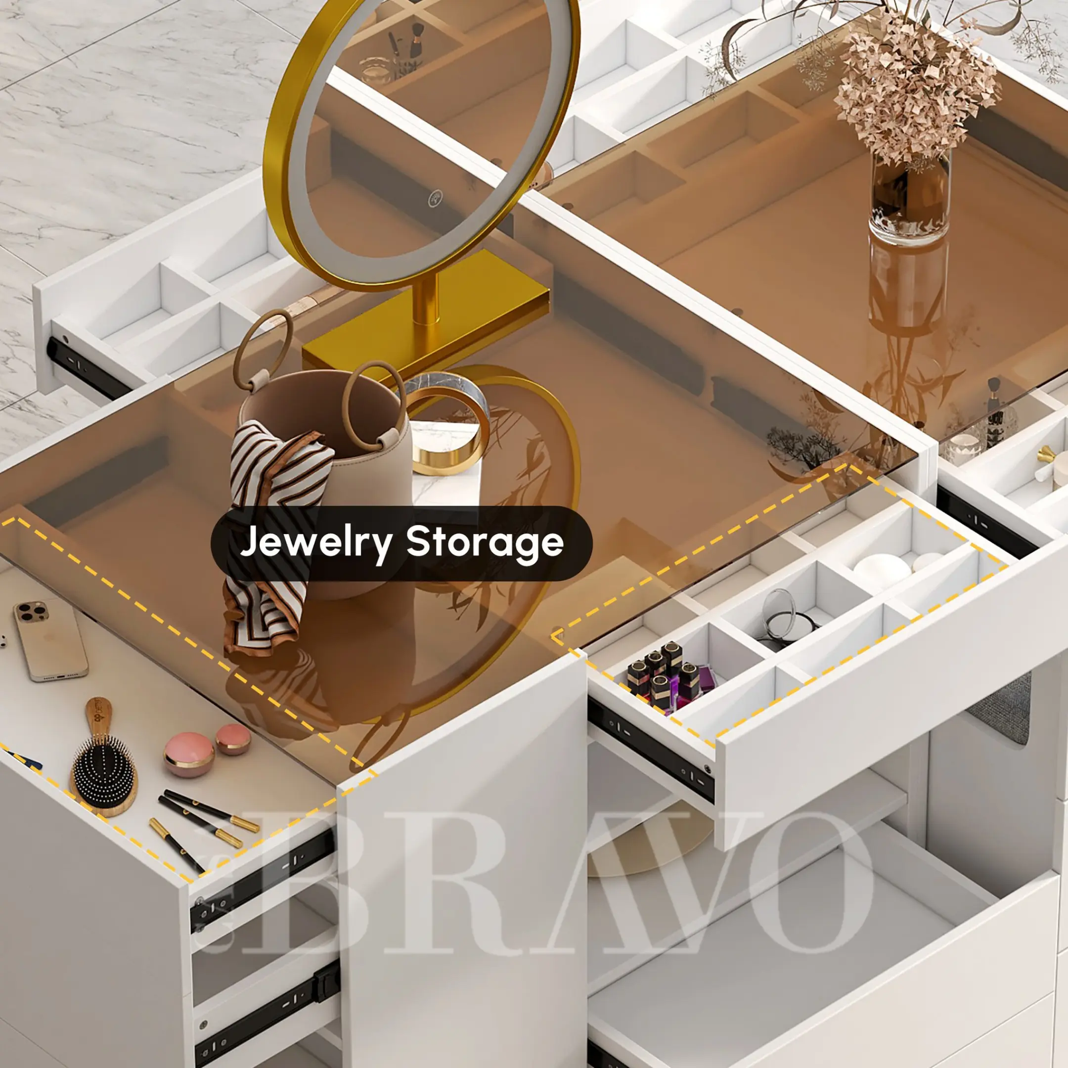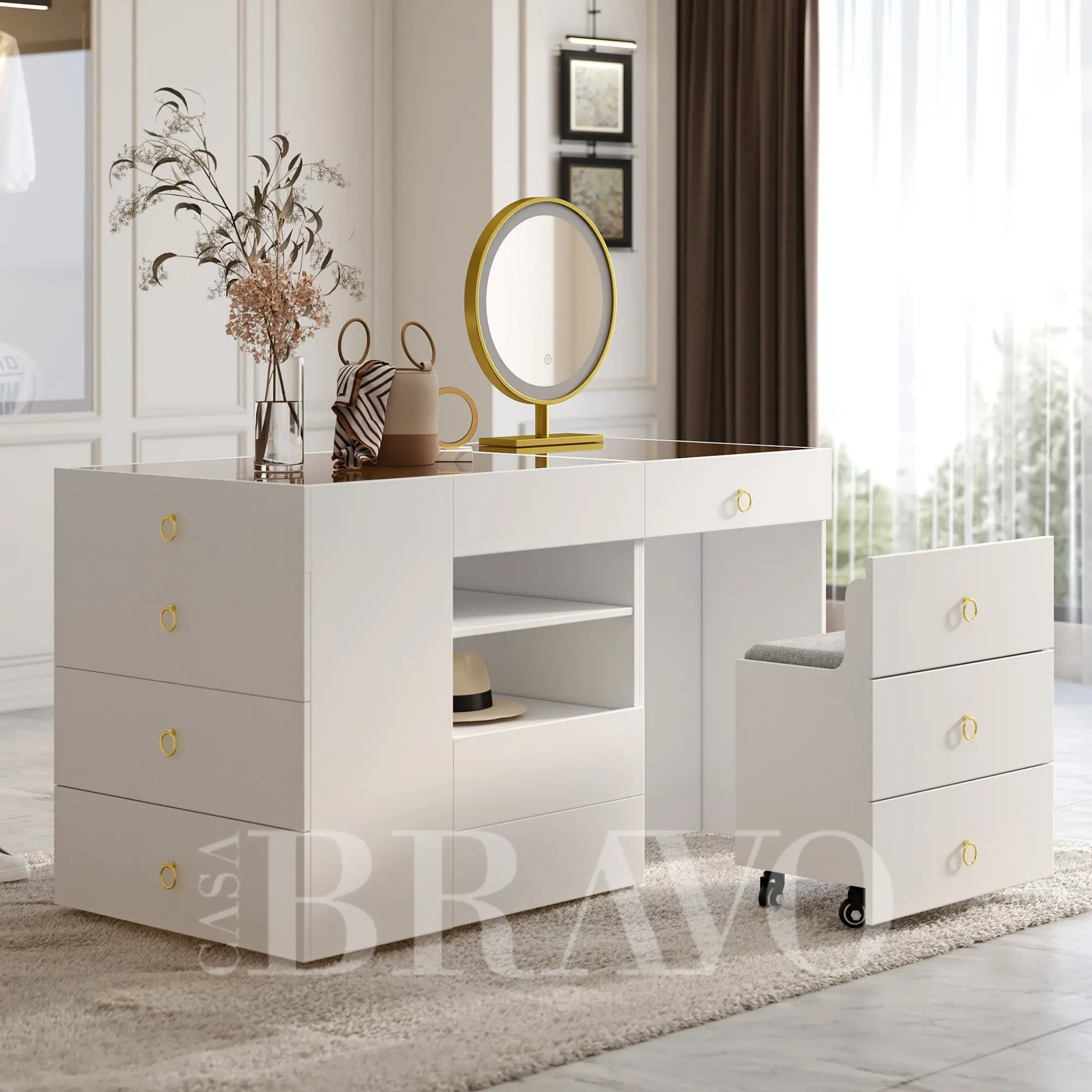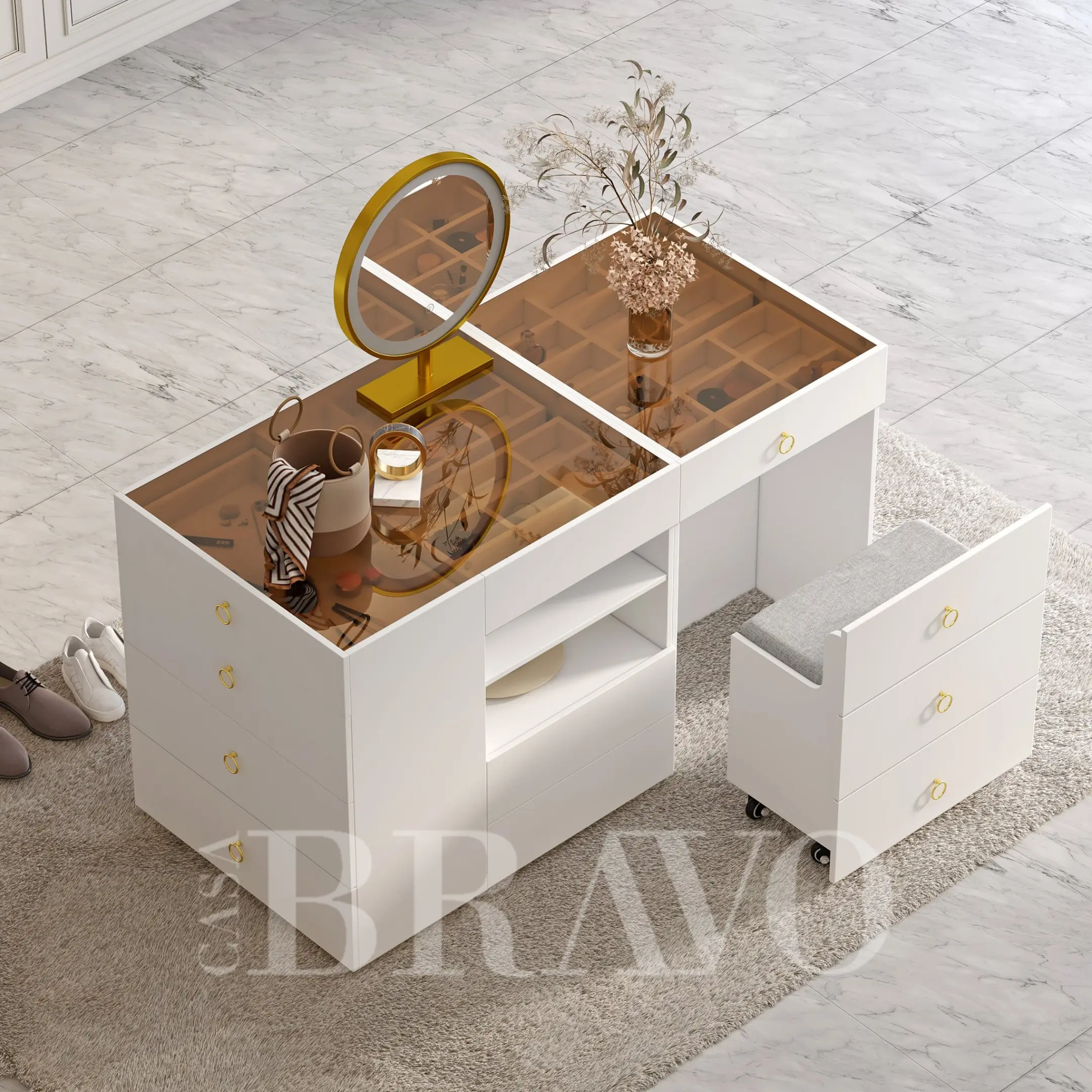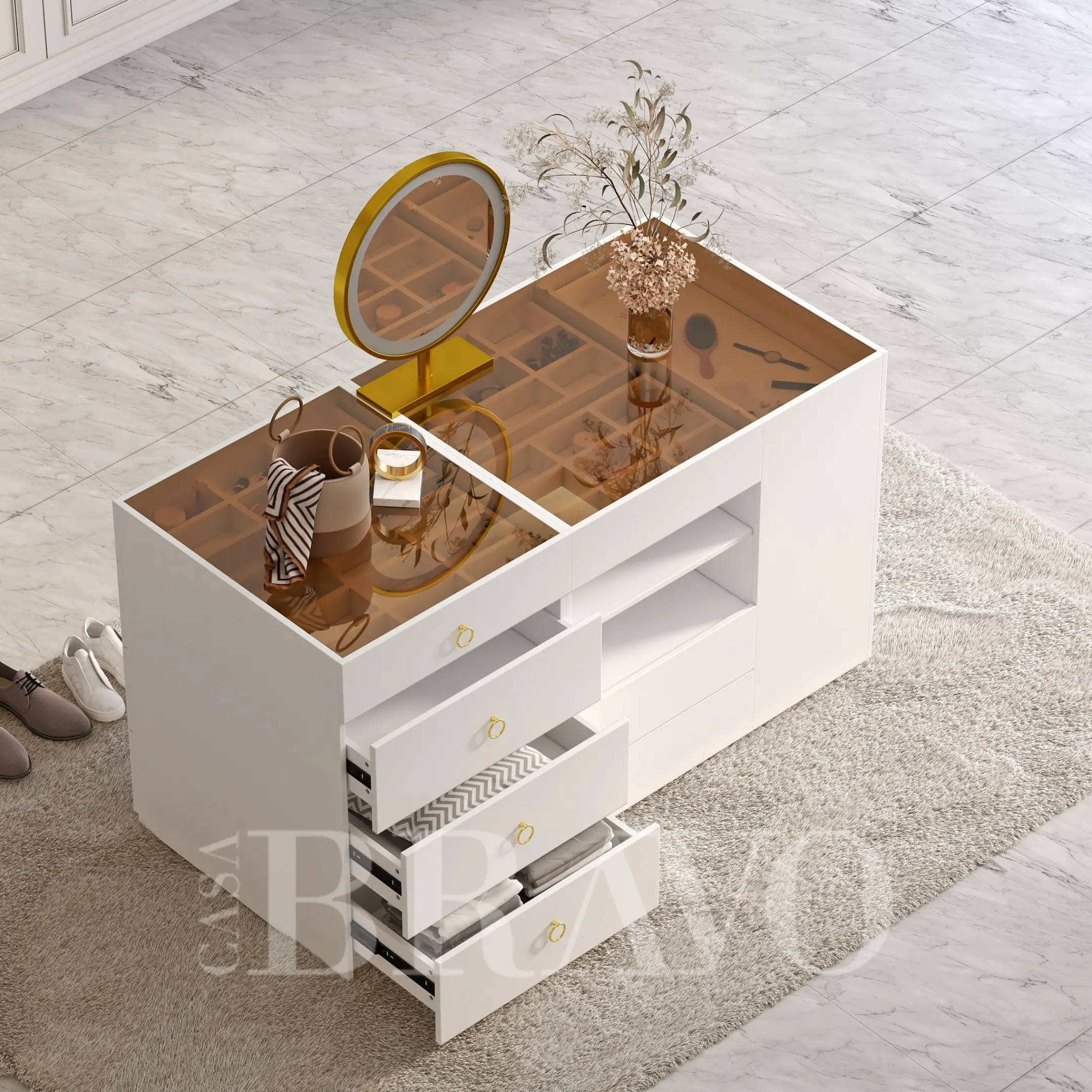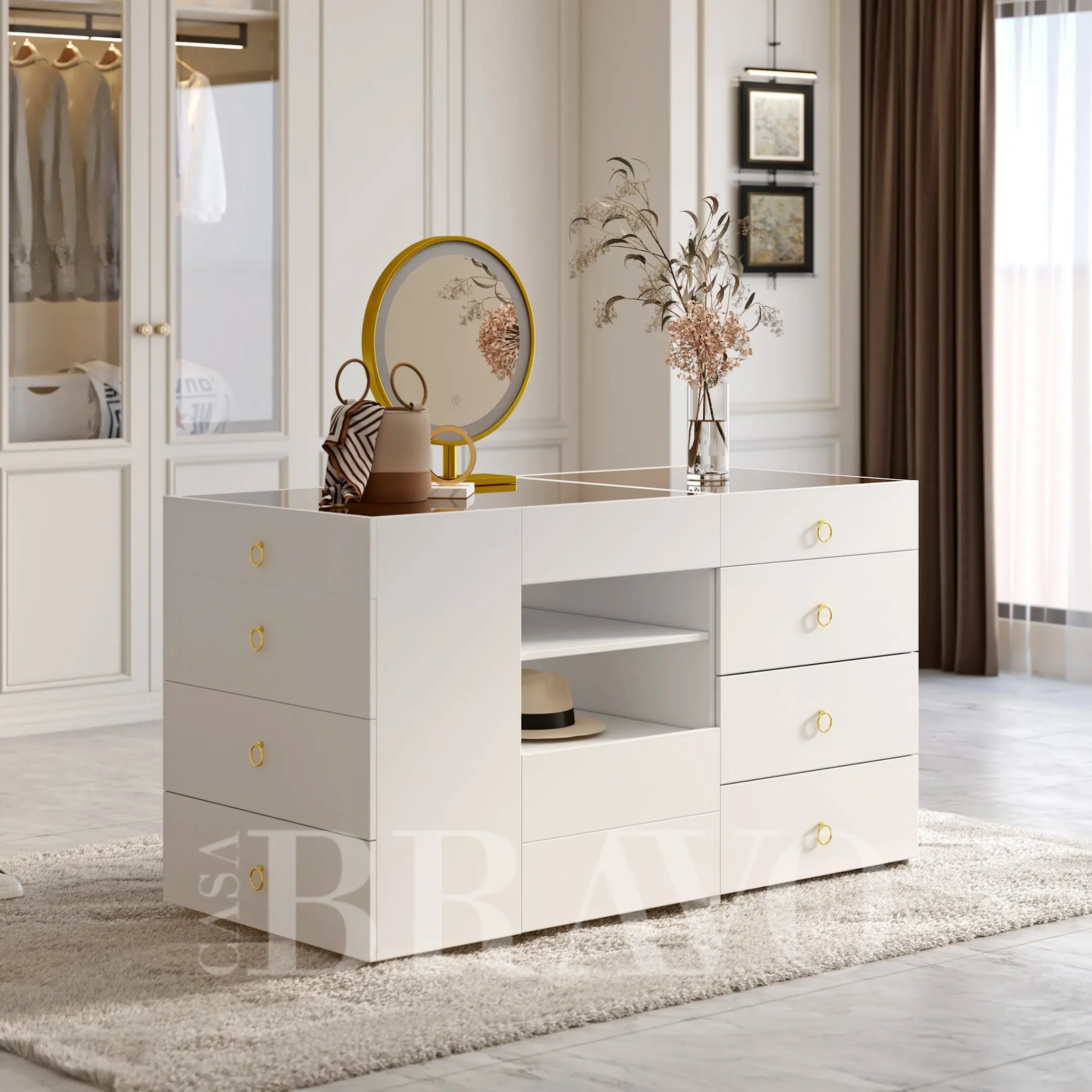 White decorative island with hidden storage chair and tempered glass top | Luxury Collection