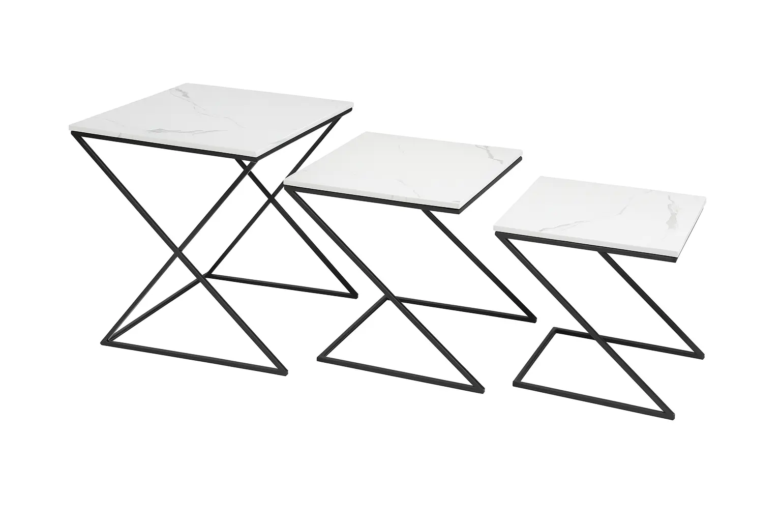 * Design: Each table features a minimalist, ‘Z’-shaped or angled metal frame that is finished in a bold, matte black. This open design allows the tables to be neatly stacked or nested together when space is limited, or pulled out and used individually when entertaining.